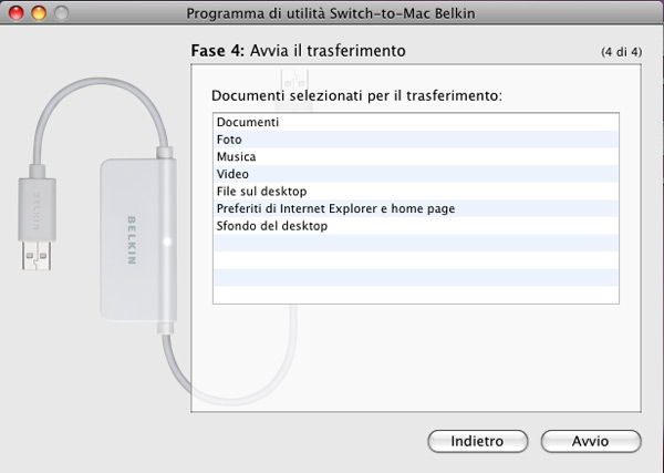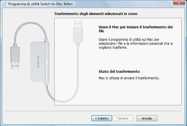 Quando siamo pronti per cominciare occorre lanciare l’esecuzione del programma Belkin sul PC e anche sul Mac: una serie di istruzioni semplici e facili da seguire, oltre tutto ben tradotte in italiano, conducono l’utente attraverso le (poche) fasi della migrazione. Così è il programma che indica il momento esatto in cui effettuare il collegamento con il cavo incluso. Quando il software rileva la connessione è possibile gestire l’intera operazione lavorando solo sul Mac.
