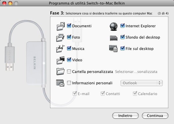 L’abbinata cavo speciale USB e del software per Mac e PC Belkin permette una migrazione completa e indolore tra i due sistemi. La soluzione funziona alla perfezione se foto, film, documenti e quant’altro sono conservati nelle cartelle di Windows preposte a quei dati, in ogni caso grazie alla possibilità di indicare manualmente le cartelle da prelevare e trasferire, l’operazione risulta agevole anche se l’utente ha personalizzato cartelle e percorsi. La durata dell’operazione ovviamente dipende dalla quantità di dati da trasferire: ricordiamo che il costruttore richiede espressamente porte USB 2.0 sia sul nuovo Mac, sia sul vecchio PC.