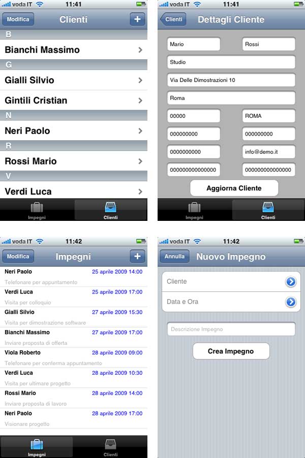 Per gli utenti di iPhone e touch è arrivato il momento di utilizzare il proprio tascabile anche per gli impegni di lavoro sostituendo definitivamente rubriche e agende cartacee. E’ possibile con l’applicazione Clienti sviluppata da Cristian Gintili che permette di gestire completamente l’archivio dei nostri clienti e degli impegni di lavoro quotidiani. Per ogni contatto è possibile inserire nome o ragione sociale, indirizzo e numero di telefono, così come email, fax e tutte le altre informazioni principali. Una volta completato l’inserimento dei nostri clienti è possibile cominciare a inserire gli impegni impostando il nome del cliente, data e ora e completando con una breve descrizione. In questo modo all’avvio il software visualizza tutti gli impegni programmati in ordine cronologico, con il nome, le informazioni essenziali dell’impegno e la descrizione.
