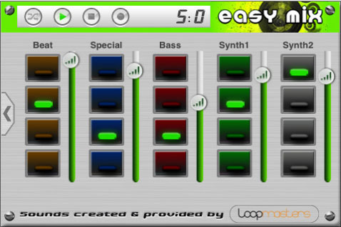 EasyMix permette di comporre musica di 5 stili diversi: techno, trance, progressive house, breaks e disco house. Lo strumento di lavoro è un mixer a 5 tracce che offre la possibilità di utilizzare 4 sample per ogni traccia, il che significa disporre di ben 3125 combinazioni possibili. Tra le altre caratteristiche principali ricordiamo l’utilizzo di loop e campioni di qualità professionale forniti da LoopMaster.com a 16bit e 44,1khz. La composizione risulta sensibilmente semplificata grazie ai meccanismi automatici: l’utente inserisce e cambia i suoni come desidera mentre il software si occupa di correggere il timing, il ritmo e la sincronizzazione.