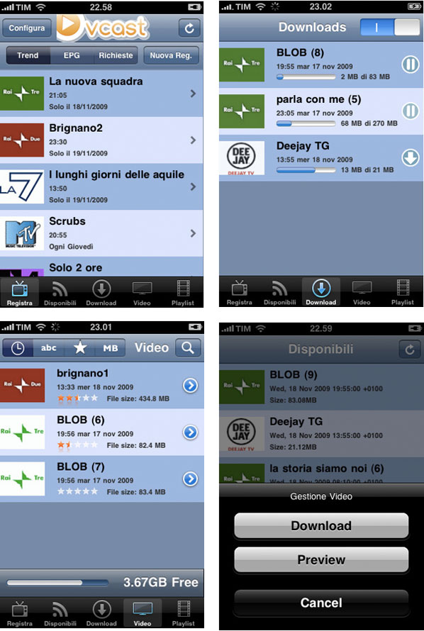 Un programma gratuito che permette di registrare e vedere la TV digitale su iPhone e touch, il tutto riducendo al minimo l’impiego del collegamento dati. Sfruttando le guie e le programmazioni elettroniche EPG l’utente può scegliere la trasmissione da registrare, scegliendo tra i canali in chiaro della TV digitale terrestre italiana. Per la registrazione dei video il software si appoggia sul servizio sperimentale Vcast: occorre creare un account gratuito sul Web.