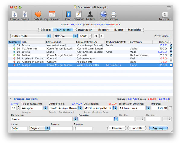 La versione 6.0 contiene una consistente serie di nuove funzioni, tra le principali ricordiamo: la possibilità di allegare documenti alle transazioni (immagine, foglio di calcolo di Excel, documenti PDF); ora nel pannello delle Pianificazioni, è presente una anteprima ed un grafico affinché si possa avere una panoramica sull’impatto delle transazioni a venire; resoconto di Bilancio Mensile, Quadrimestrale, Semestrale ed Annuale. à possibile importare i resoconti bancari usando un insieme di regole definibile dall’utente