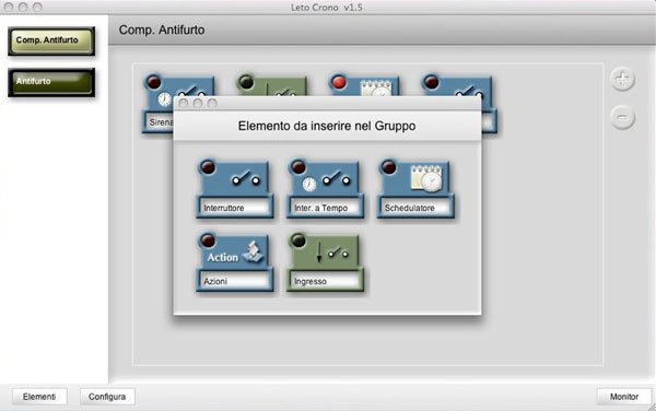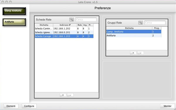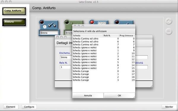 Grazie a una serie di schede relé che il Mac può gestire tramite il collegamento di rete Ethernet, il nostro computer può controllare una serie di comunicazioni in ingresso e uscita con il mondo esterno. Le schede relé sono realizzate dalla società Progetti HW SW mentre la parte software è realizzata dal programmatore Antonio Caputo. Battezzato con il nome LetoCrono il programma è attualmente in fase di test e una volta completato permetterà di programmare in modo semplice e con approccio visuale tutte le funzioni e i segnali in ingresso e uscita che dalla scheda relé giungono al Mac.