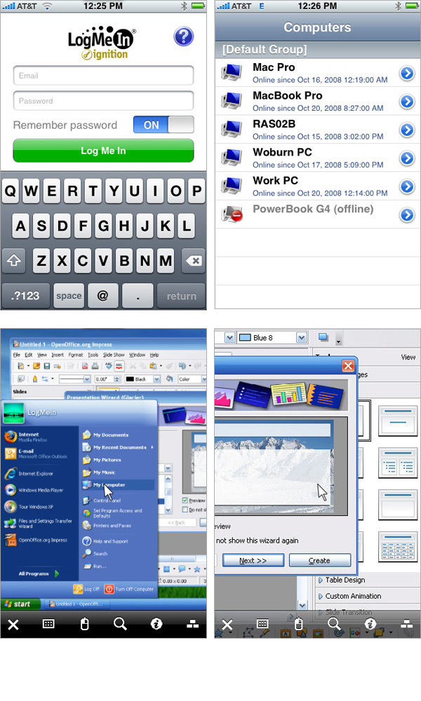 Compiute queste operazioni preliminari è sufficiente lanciare il programma LogMeIn Ignition su iPhone e touch per accedere al computer di casa o dell’ufficio, o qualsiasi altro sistema Mac o PC in rete che desideriamo controllare a distanza.