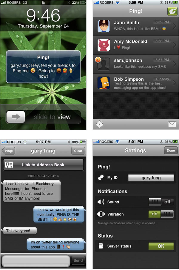 Il programma Ping! che promette di rivoluzionare lo schema di utilizzo dei messaggi di testo è ora disponibile su App Store nella nuova versione 1.01. Il software sfrutta il collegamento a Internet di iPhone e iPod touch e permette di scambiare messaggi in stile SMS con tutti gli altri utenti dei tascabili touch della Mela a costo zero, ovviamente dando per scontato la presenza dell’accesso alla Rete.