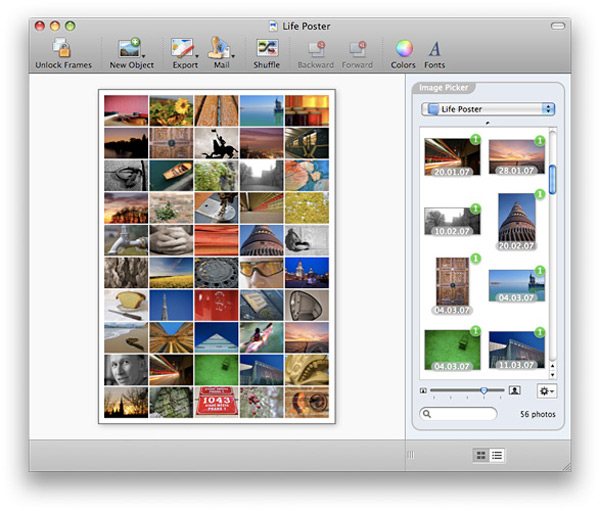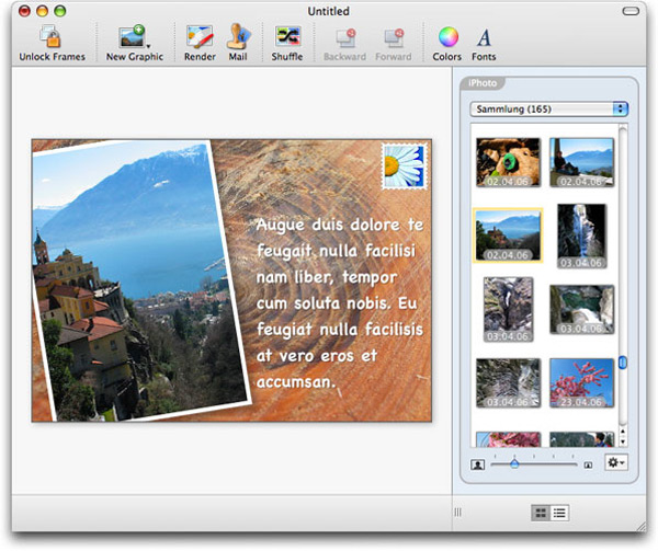 Infine per gli utenti che desiderano il massimo controllo e che sono disposti a investire un po’ del loro tempo per creare poster e cartoline curati nei dettagli è possibile gestire l’intera procedura manualmente: dal modello di base fino alla scelta di ogni singolo scatto. Posterino offre numerosi modelli già pronti non solo per poster ma anche per cornici, cartoline e biglietti di auguri. Permette di navigare attraverso tutte le nostre fotografie con un browser integrato che comunica direttamente con iPhoto, Aperture e qualsiasi altra cartella che l’utente indica. ancora permette di tagliare, ruotare, modificare foto e contorno per personalizzare ulteriormente il risultato finale.