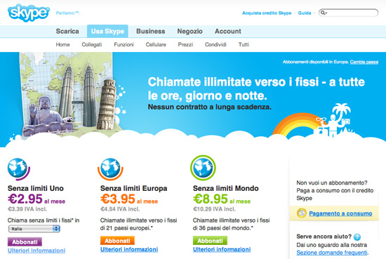 In questa pagina troviamo gli abbonamenti mensili di Skype con prezzi molto interessanti.