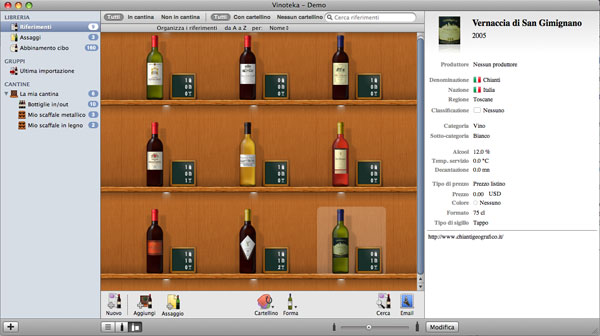 Per i cultori del vino e allo stesso tempo utenti Mac Active propone il nuovo programma Vinoteka completamente tradotto in Italiano e ora disponibile nella versione 1.2. Grazie a questo programma è possibile gestire con il nostro computer preferito la raccolta di vini e liquori utilizzando una interfaccia grafica allo stesso tempo simpatica e accattivante. Sullo schermo abbiamo la riproduzione degli scaffali di una cantina reale, su cui possiamo posizionare le nostre bottiglie con tanto di etichetta. L’utente può personalizzare l’aspetto degli scaffali, diversi modelli in legno e anche in metallo, infine scegliere il tipo e la forma di bottiglia preferito.