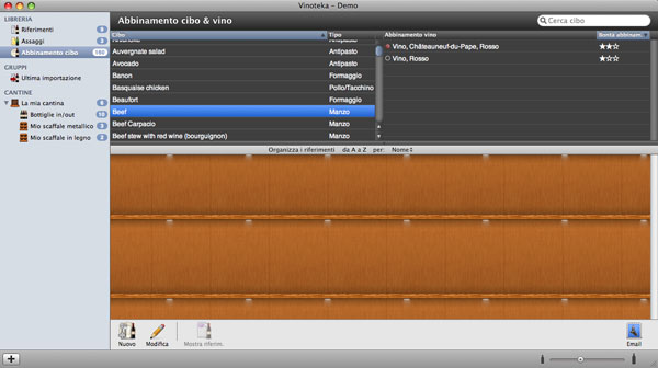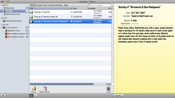 Tra le altre funzioni principali ricordiamo la possibilità di gestire e annotare tutte le sessioni di degustazione con una spazio apposito associato a ogni vino in cui è possibile inserire note e commenti. Infine il tutto è completato da una sezione dedicata agli abbinamenti vino e cibi: quando scopriamo un nuovo abbinamento riuscito è sufficiente annotarlo in Vinoteka per creare così un database dei migliori accompagnamenti.