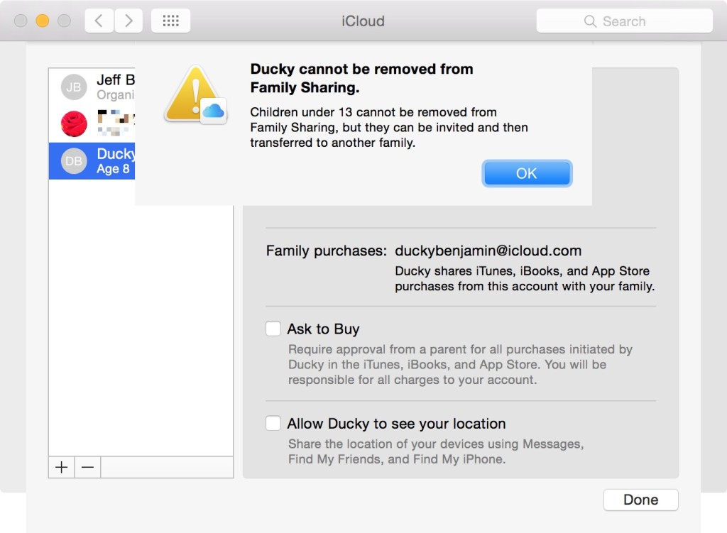 Rimuovere l’account di un bambino aggiunto alla lista degli account abilitati per la “Condivisione in Famiglia” di Apple non è possibile. Almeno non manualmente. Lo rivela un giornalista di iDownloadBlog condividendo la sua esperienza riguardo proprio la rimozione di un account per bambini, nel suo caso aggiunto lo scorso anno per alcuni test della nuova funzione introdotta con iOS 8.
