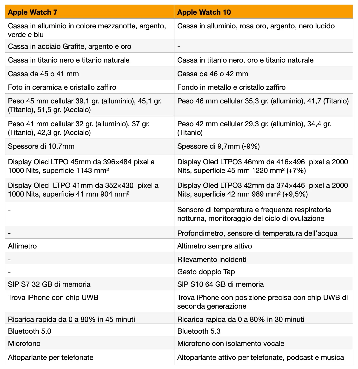 Per farlo mettiamo Apple Watch a confronto non con Apple Watch 8 o Apple 9 ma con Apple Watch 7, questo perché come abbiamo accennato, gli ultimi due Apple Watch prima di Apple Watch 10 hanno differenze trascurabili con Apple Watch 7.