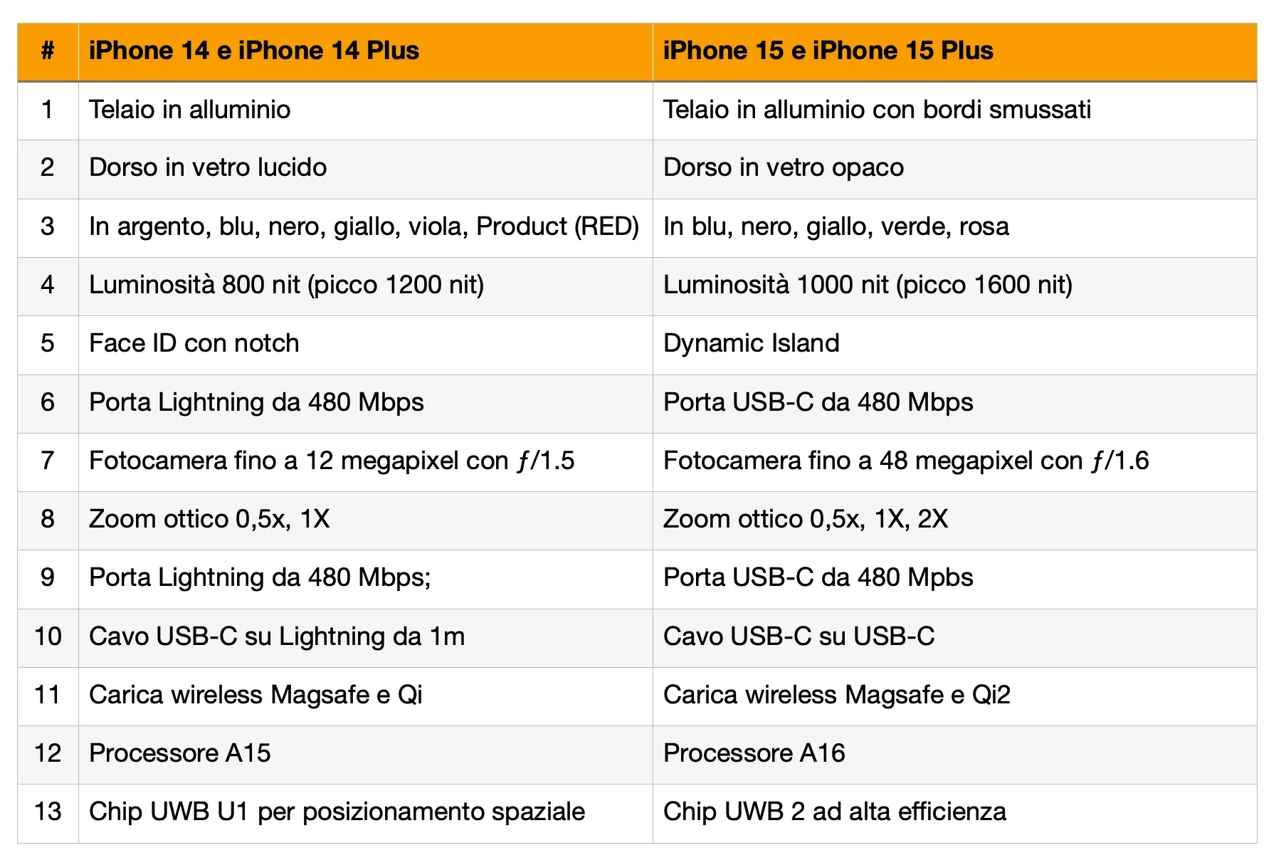 Anche qui, le differenze rispetto allo scorso anno ci sono. Mentre iPhone 14 e 13 condividevano la stessa CPU, iPhone 15 fa il salto di qualità, proponendo il chip A16 usato da iPhone 14 Pro lo scorso anno.