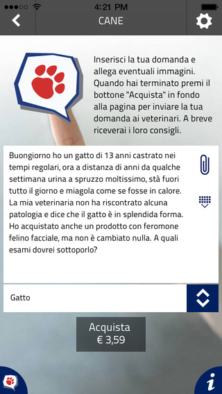 Ma il punto di forza di Consiglio dal Veterinario, come la “cugina” Consiglio dal Medico è l’accesso diretto ad una comunità veterinaria composta da una cinquantina di specialisti qualificati. L’utente ha infatti la possibilità di fare una domanda e ricevere comodamente sul proprio telefono i consigli di diversi veterinari. Ogni consulto costa 3,59 euro e serve soprattutto per verificare la possibilità di risolvere il problema del nostro amico a quattro zampe in casa, o se serve una visita nell’ambulatorio del nostro veterinario di fiducia.