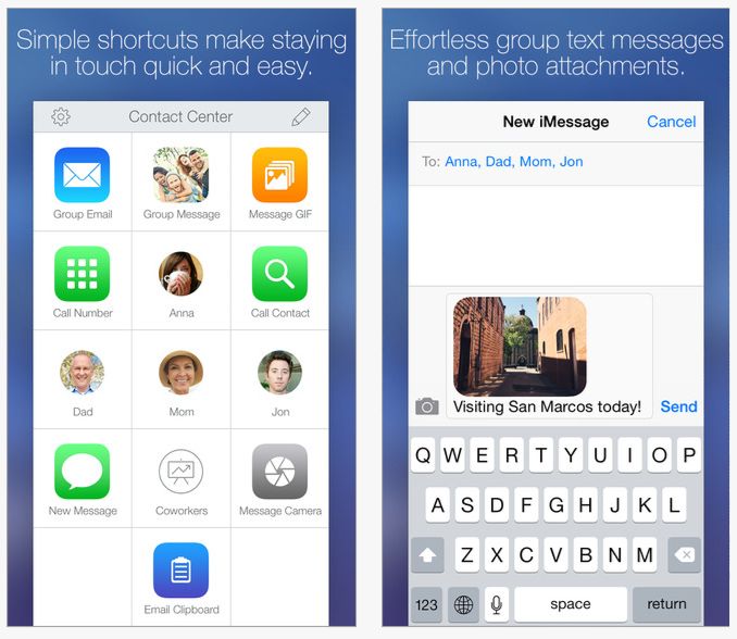 Contact Center è un’applicazione concepita per velocizzare telefonate e messaggi verso utenti preferiti, con cui si scambiano quotidianamente informazioni. In estrema sintesi può essere considerata come una sorta di Launch Center Pro semplificato, incentrato esclusivamente sui messaggi e le chiamate. L’applicazione è gratuita e davvero molto funzionale, ma per rimuovere il fastidioso banner presente in basso è necessario acquistare un pacchetto IAP da 2,69 euro.