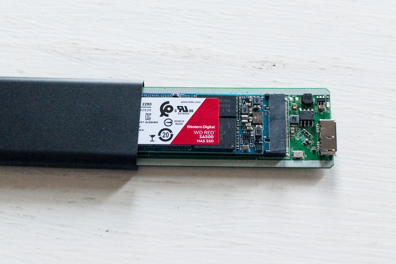 Nella seconda un più tradizionale case SATA da 2,5″ UGREEN con USB-C, accompagnato da un disco SSD Western Digital WD RED SA500 da 2,5″ sempre da 1 TB.