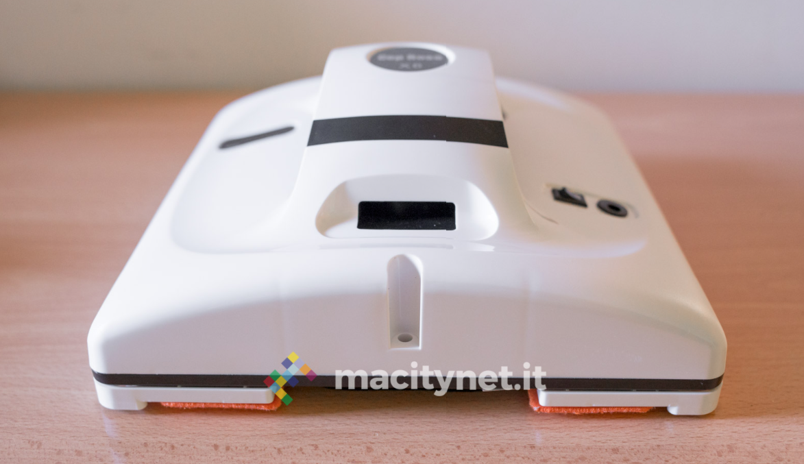 Il robot, anziché presentare le due classiche piastre rotanti, è composto da un unico pezzo di forma quadrata, con un’area centrale scoperta e sulla quale troviamo la griglia di aspirazione, utile per creare il sottovuoto tra robot e vetro mantenendolo così incollato alla superficie. I movimenti del lavavetri sono assicurati da due cingoli in gomma, anch’essi progettati per aumentare l’aderenza del robot alla superficie ed assicurare i giusti movimenti senza mai scivolare.