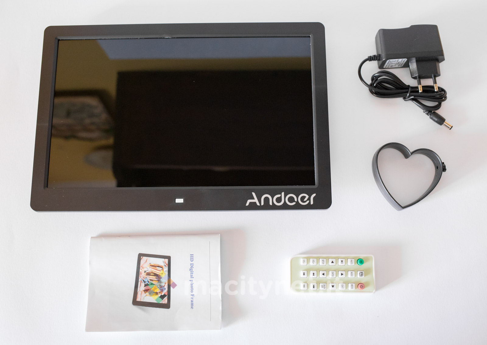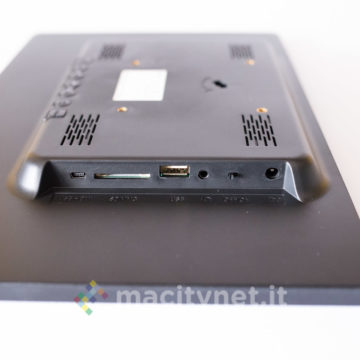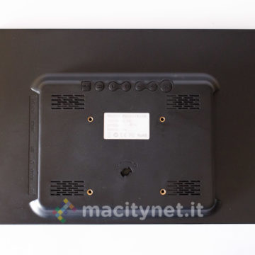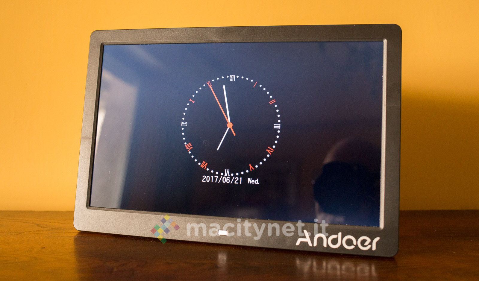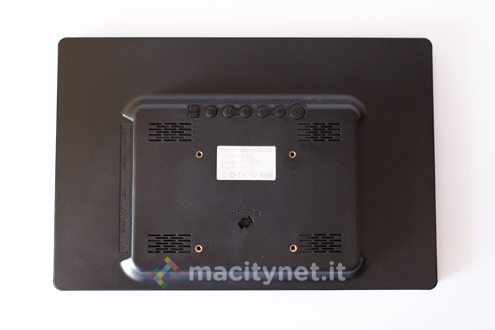 La cornice digitale è rettangolare, con angoli smussati e con bordi piuttosto sottili: complessivamente misura 31.5 x 21 centimetri mentre il display occupa una superficie di 28.2 x 17 centimetri: in pratica il bordo della cornice misura appena 1.5 centimetri. Ottimo anche lo spessore della cornice digitale, pari a 1 centimetro, sebbene l’area centrale posteriore sia spessa il doppio per poter contenere tutti i componenti e i circuiti interni.