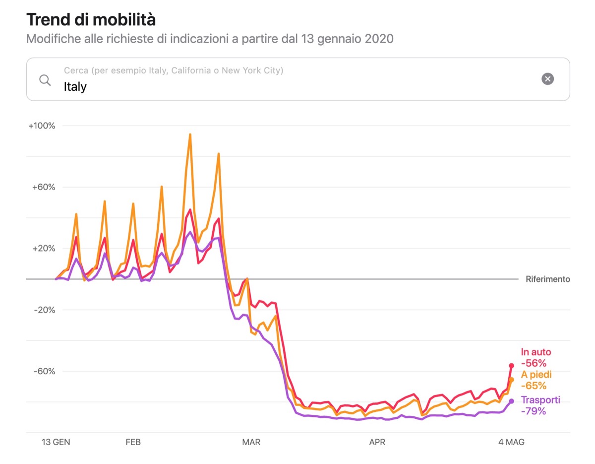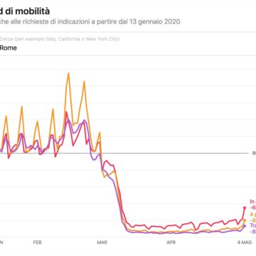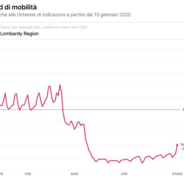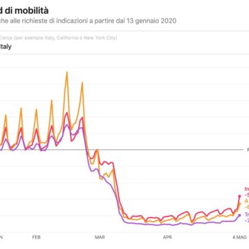Come dicevamo l’obiettivo che si prefigge Apple è quello di offrire una sorta di grafico con le tendenze di mobilità, in modo da avere un dato in più per consentire alle aziende sanitarie di rallentare la diffusione del virus. Per accedervi è sufficiente utilizzare lo strumento online ed effettuare una ricerca per paese, regione o città e vedere le tendenze di un’area specifica.