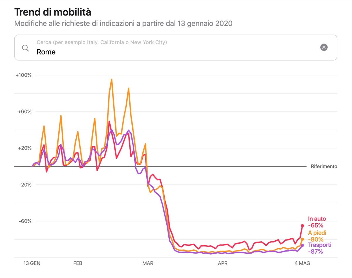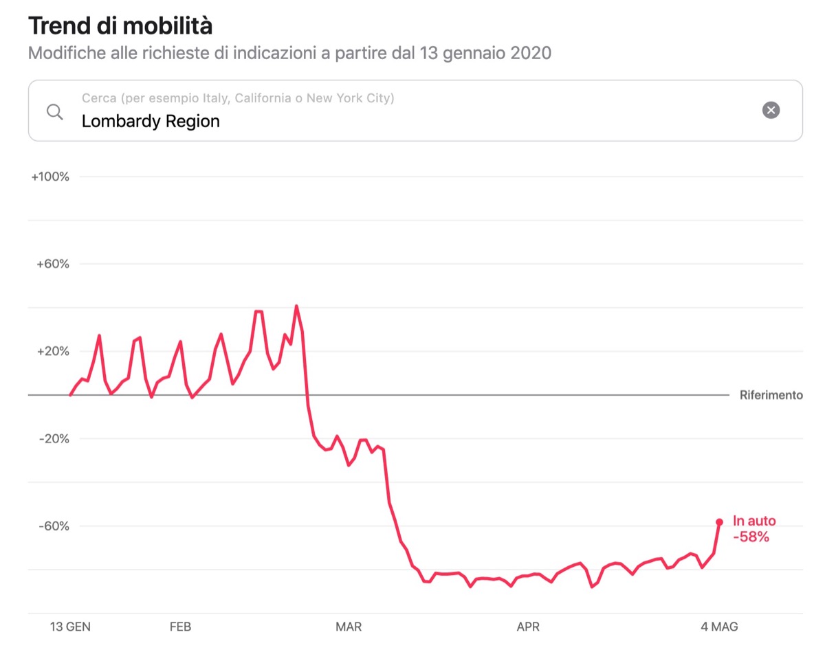 Si può ad esempio digitare “Italy” per avere uno sguardo d’insieme del nostro paese con le tendenze relative agli spostamenti in auto, a piedi e con i mezzi pubblici, oppure si può digitare “Lombardy Region” per rilevare il dato relativo alla regione Lombardia o, più nello specifico, si può digitare “Milan” o “Rome” per l’analisi sulle due metropoli.