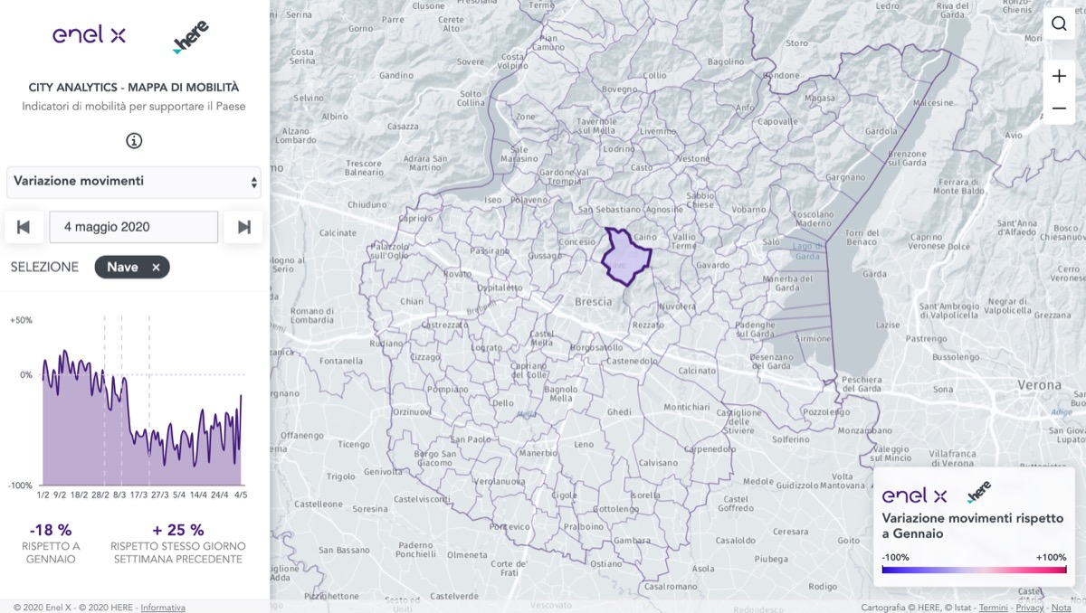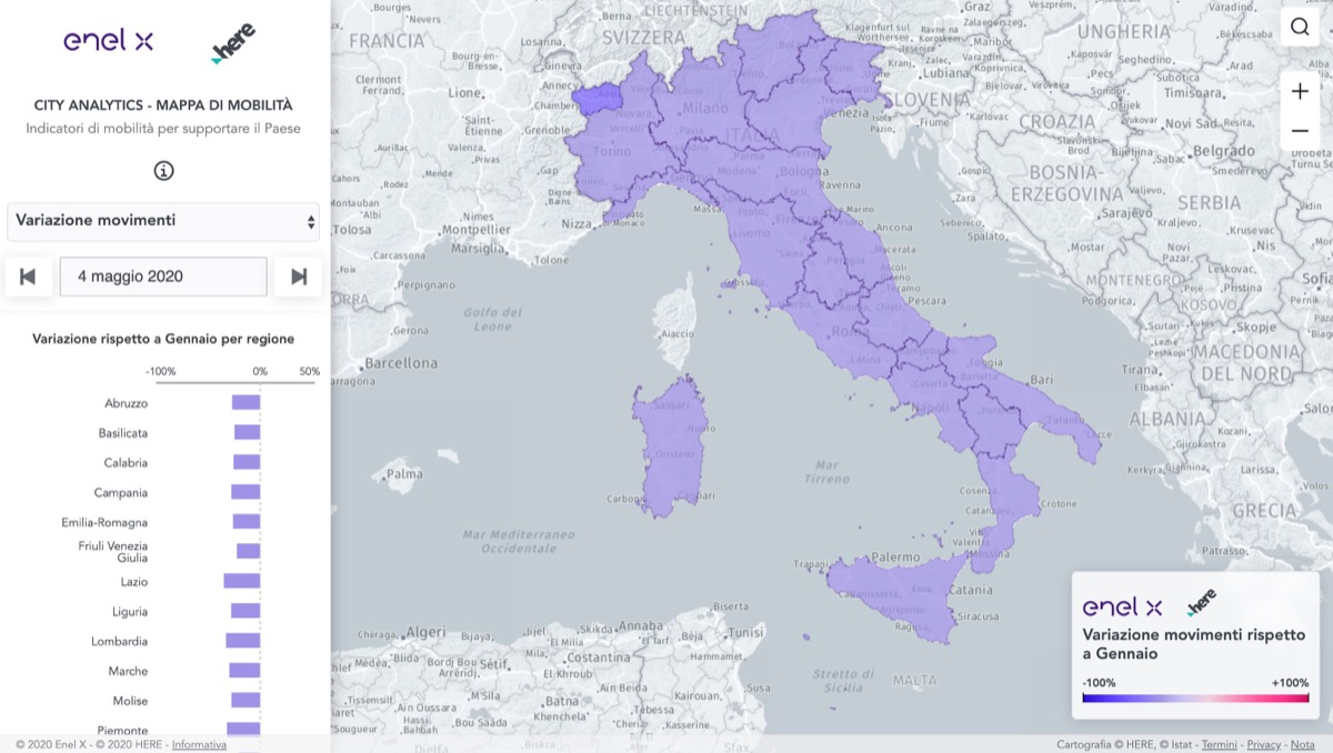 Ad oggi, per l’Italia un dato più preciso viene fornito dalla mappa della mobilità sviluppata da Enel X che si basa sulla cartografia Here. Qui, oltre a poter dare uno sguardo più approfondito ai singoli comuni di tutto il paese, si possono analizzare le tendenze relative alla variazione dei movimenti, dei chilometri percorsi nonché i flussi in entrata e in uscita.
