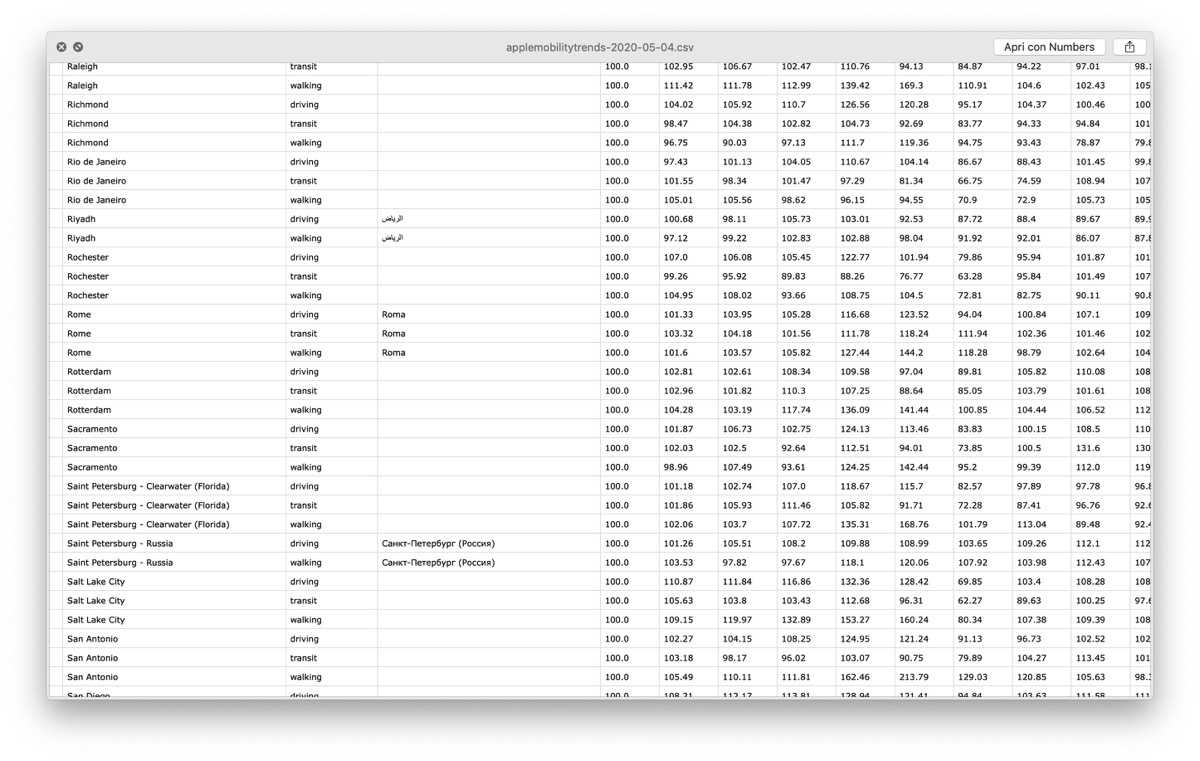 Per quanto riguarda l’Italia, per il momento sono mappate tutte le regioni e le principali città italiane. I dati, oltre ad essere analizzati sul portale di Apple, si possono anche esportare in un file CSV con schedatura giornaliera, in modo da affiancare una visione approfondita a quella d’insieme fornita dal pannello online.