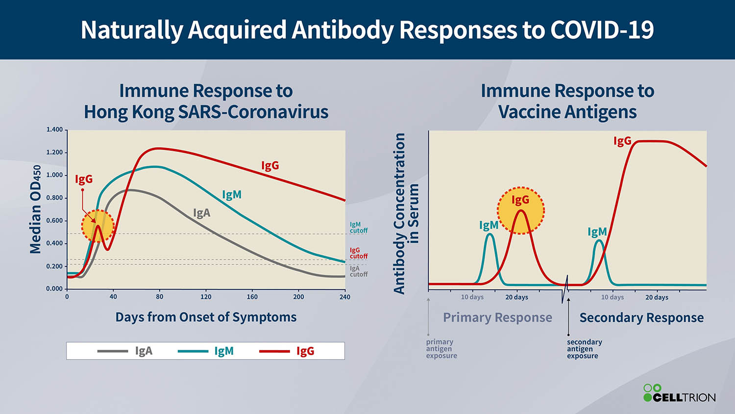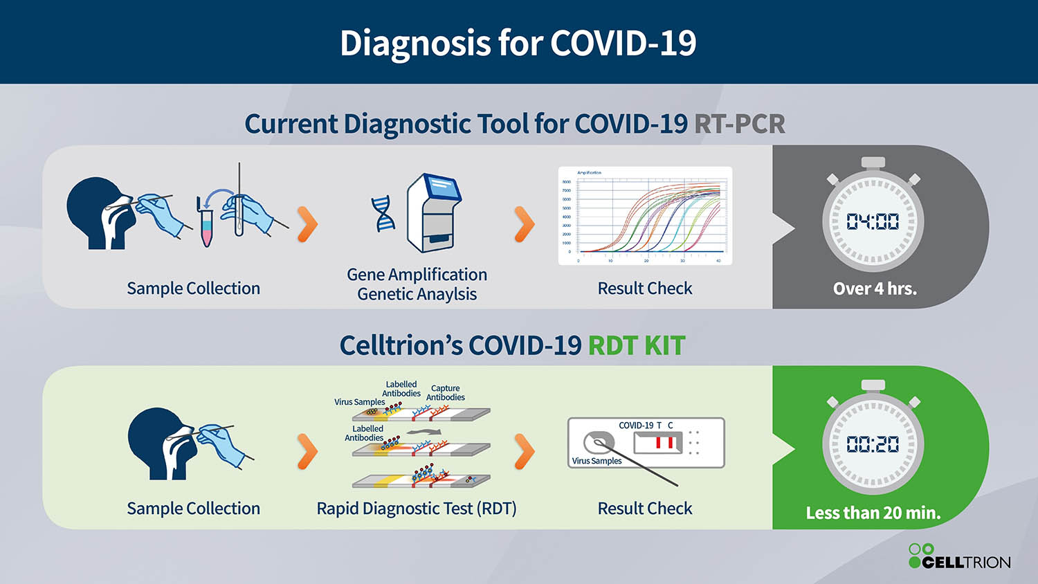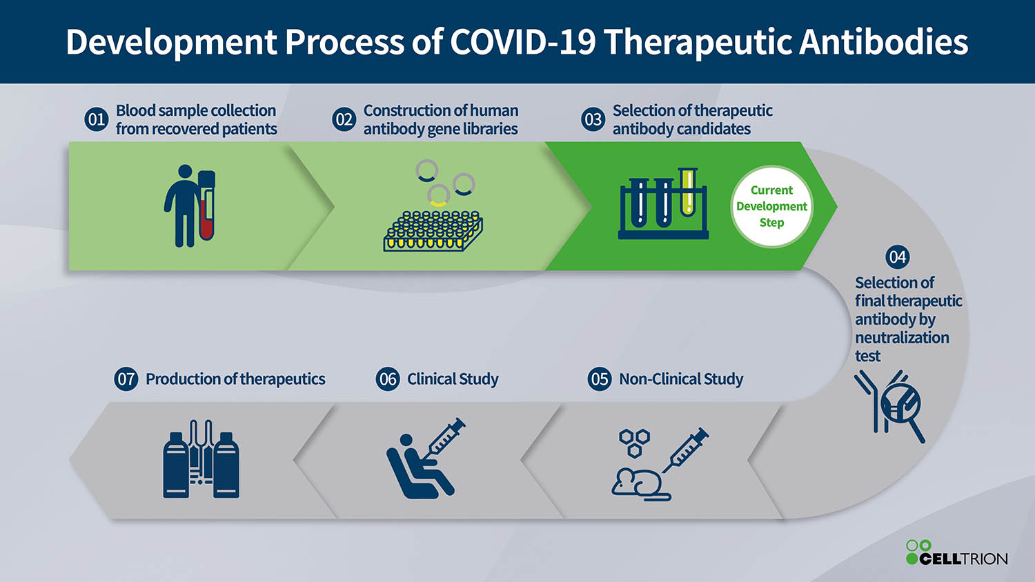 La Corea è stata uno dei primi paesi ad essere colpito dalla pandemia. Celltrion ha identificato la libreria di anticorpi prelevati dal sangue di pazienti guariti in Corea e che si ritiene siano coinvolti nella neutralizzazione del virus, potendo quindi contribuire alla guarigione dalla COVID-19. Questi anticorpi vengono sottoposti a ulteriori esami per identificare quelli che sono più efficaci nel neutralizzare il virus responsabile della COVID-19. Una volta identificati, formeranno la base del trattamento antivirale che verrà testato in sperimentazioni precliniche e cliniche in tutto il mondo nel terzo trimestre 2020.