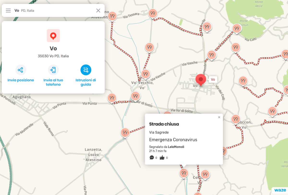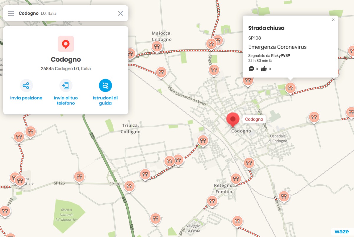 Tempestivo è stato infatti l’intervento della community italiana di Waze, che si è attivata volontariamente per aggiornare in tempo reale la mappa stradale nelle zone colpite con lo scopo di fornire sia una panoramica della situazione della viabilità aggiornata per i cittadini in transito nelle aree limitrofe a quelle bloccate, sia per evitare eventuali disagi per i mezzi autorizzati all’approvvigionamento quotidiano degli abitanti delle zone poste in isolamento.