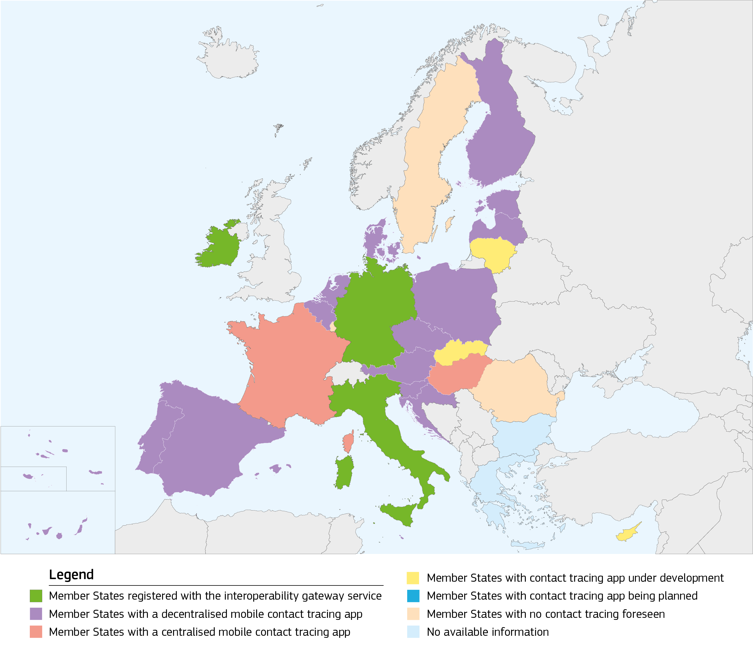 Al termine di una fase pilota che ha dato esito positivo, il sistema è entrato in funzione con una prima serie di app nazionali collegate attraverso questo servizio: la tedesca Corona-Warn-App, l’irlandese COVID Tracker e l’italiana Immuni. Complessivamente queste app sono state scaricate da circa 30 milioni di persone, corrispondenti ai due terzi di tutti i download di app nell’UE.