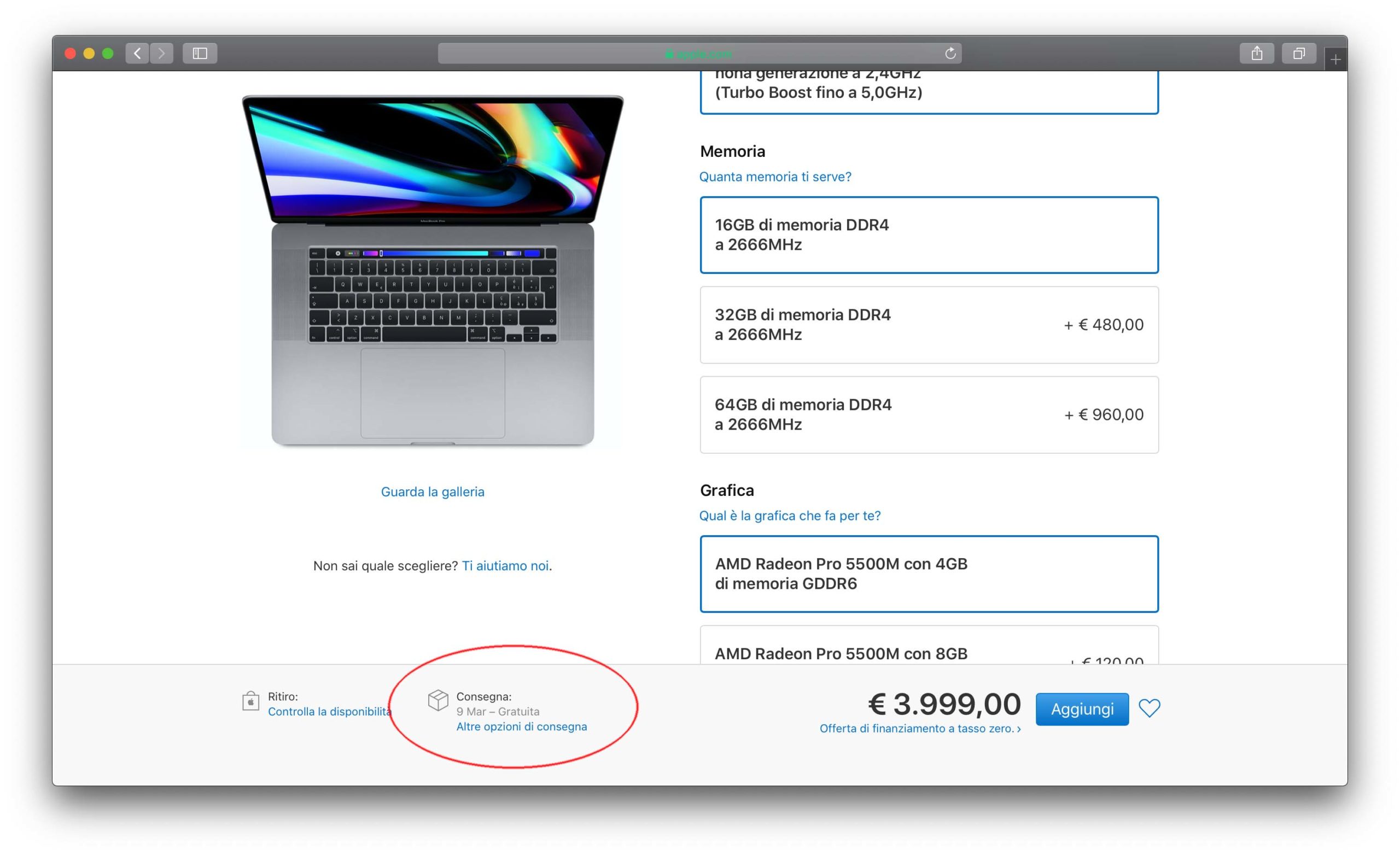 Nel momento in cui scriviamo, ordinando ad esempio un MacBook Pro 16″ base la data di consegna prevista è martedì 11 Feb; cambiando processore, RAM, grafica o unità SSD, la data di consegna slitta al 9 marzo.