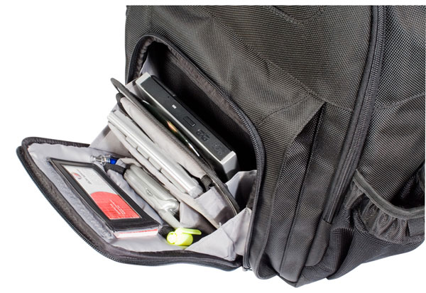 Traveller Backpack di Targus è un perfetto sostituito delle borse per notebook, grazie al riuscito mix di design sobrio ed elegante unito alla praticità di utilizzo e alla capienza offerti dal formato zaino. Realizzato in resistente nailon balistico, Corporate Traveller Backpack è suddiviso in tre vani principali a cui è possibile accedere dall’alto tramite chiusure lampo. Il vano più compatto si trova nella parte frontale: una volta aperto scopriamo uno spazio piuttosto profondo e completamente organizzato per ospitare gli accessori e gli oggetti più piccoli. Oltre al porta-biglietti da visita, troviamo due tasche con chiusura a velcro, due portapenna, una tasca a rete più ampia con chiusura a cerniera, un portachiavi e persino 5 vani antigraffio pronti per ospitare CD e DVD.