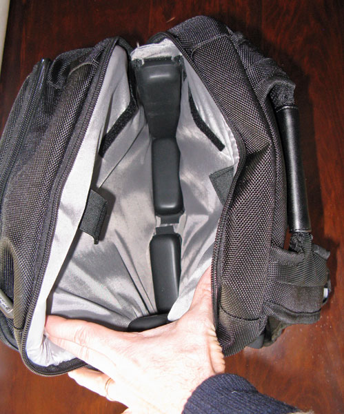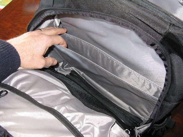 Il terzo e ultimo comparto è quello dedicato al portatile: anche se il costruttore specifica notebook con schermo fino a 15,4″ a nostro parere il vano è sufficientemente ampio per ospitare anche macchine un po’ più grandi. Va comunque tenuto presente che parte dello spazio interno disponibile è occupato da 4 grandi speciali cuscinetti ad aria che servono sia per mantenere in posizione il notebook sia per proteggerlo da urti e scossoni. Si tratta del sistema brevettato SafePort Air Cushion System: i 4 cuscinetti sono fissati all’interno del vano con del resistente velcro, permettendo così all’utente di regolarne la posizione e la distanza per adattarli ai notebook più piccoli.