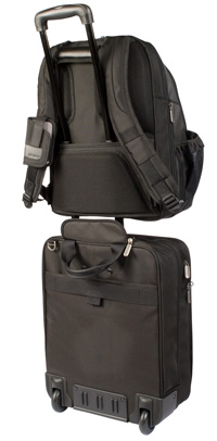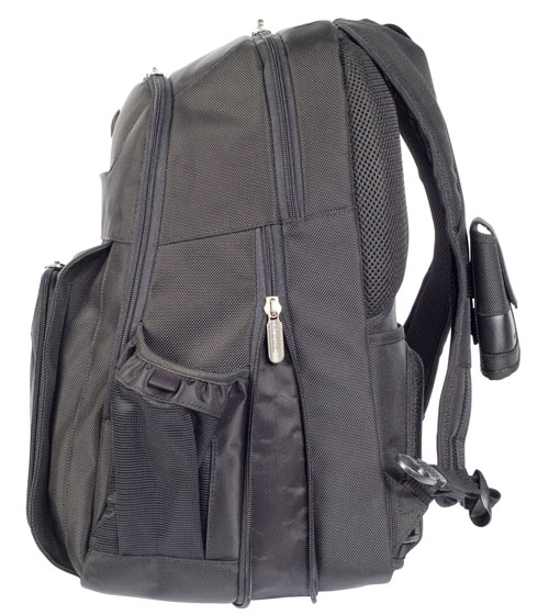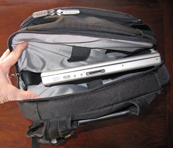 Una volta che il notebook è riposto nell’apposito vano si trova completamente al sicuro: i cuscinetti d’aria sul fondo della borsa e anche ai due lati proteggono il computer contro gli urti verticali e anche quelli laterali. Nella parte frontale il notebook è protetto dagli altri due grandi vani in cui si sviluppa la borsa. Infine nel lato posteriore che durante il trasporto aderisce alla nostra schiena, lo zaino offre una consistente imbottitura sagomata, a protezione del notebook e anche delle spalle e della schiena dell’utente. La particolare forma anatomica si adatta alla schiena e permette all’aria di circolare, un risultato ottenuto anche grazie al rivestimento in tessuto reticolare. Il design ergonomico è esteso anche agli spallacci: nella nostra prova trasferendo tutto il materiale e l’attrezzatura da una borsa precedente al Corporate Traveller Backpack abbiamo notato un alleggerimento del carico, senz’altro dovuto al minor peso a vuoto della Targus pari a 1,4 chili, ma anche alla intelligente ripartizione dei pesi ottenuta grazie allo schienale e agli spallacci anatomici.