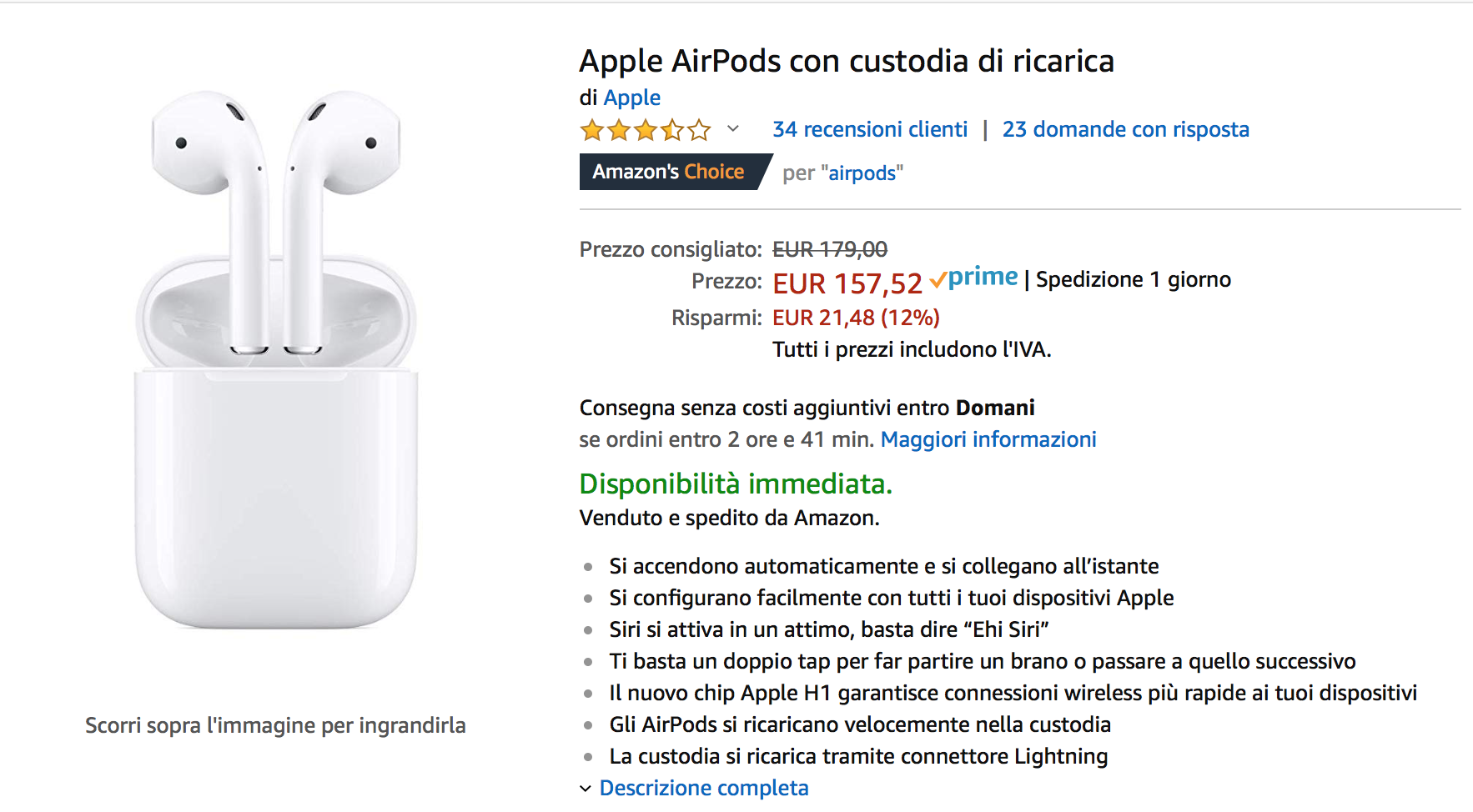 Solo poche ore fa vi segnalavamo il primo, modesto ma interessante, sconto sulle Airpods 2 su Amazon e ora sempre su Amazon gli auricolari della Mela scendono ancora e ad un prezzo per il quale è difficile persino comprare gli Airpods di prima generazione: solo 157 euro.