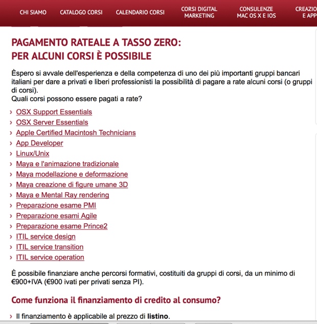 Risponde Luigi Danieli, Amministratore Delegato di Èspero, Apple e Adobe Authorized Training Center, presente a Milano e Roma dal 1991: “Sono attive in Italia e in Lombardia molte forme di finanziamento per le aziende (Fondi Interprofessionali e Formazione Continua) e per i lavoratori in situazione di difficoltà (Dote Riqualificazione), ma ci siamo accorti che, per il momento, non c’è nulla per privati e liberi professionisti, allora ci siamo attivati per loro con il credito a consumo a tasso zero”.