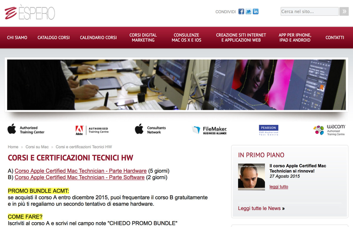 Tutti tecnici possono essere esperti e qualificati in hardware Apple con Èspero. Il centro didattico milanese (che però opera anche a Roma) ha recentemente aggiornato il corso ACMT (Apple Certified Mac Technician) secondo il nuovo curriculum di Apple (durata 7 giorni di cui 5 hardware e 2 software) e rilancia con la promo 2015: chi acquista i 5gg hardware ha in omaggio i 2gg software (inclusi esami, con tentativo aggiuntivo).