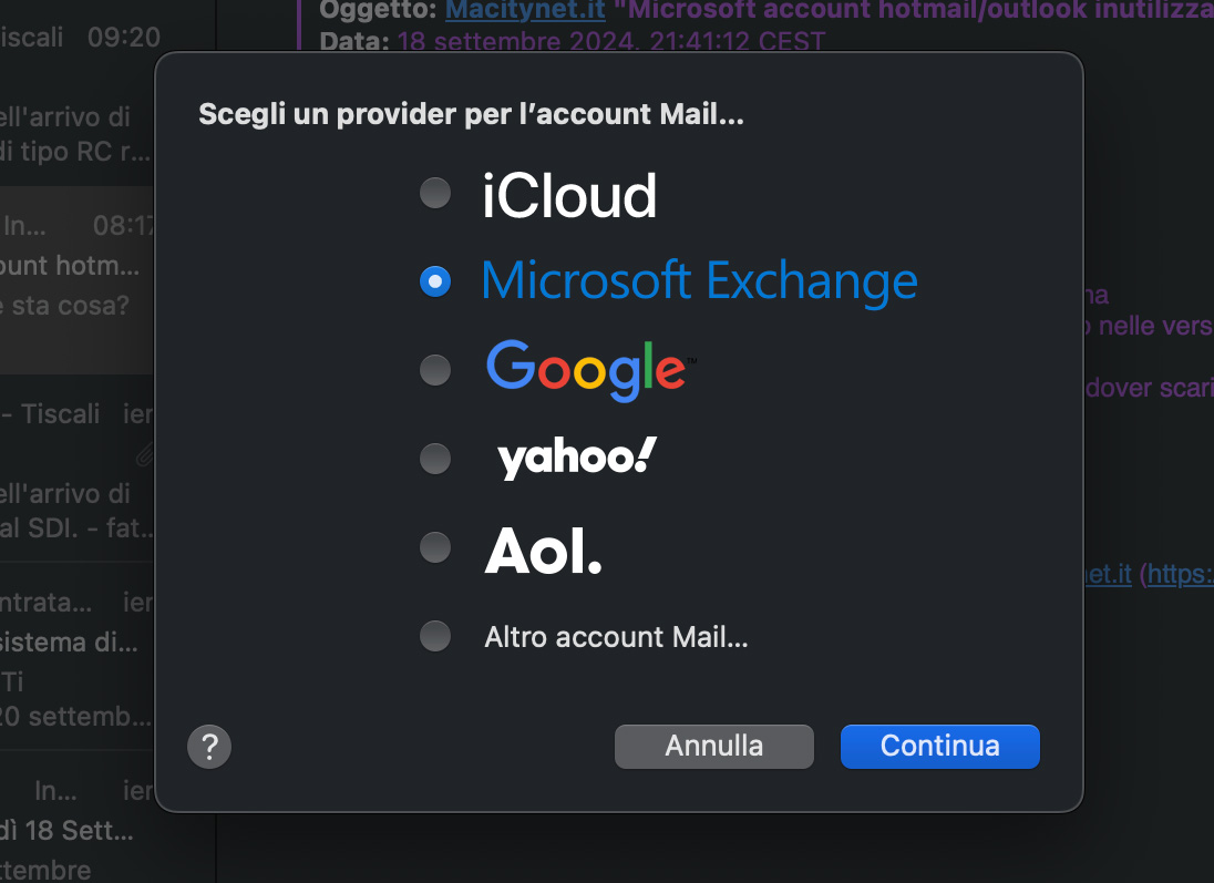 - Appare una finestra: selezionate l’opzione “Microsoft Exchange” e fate click su “Continua”