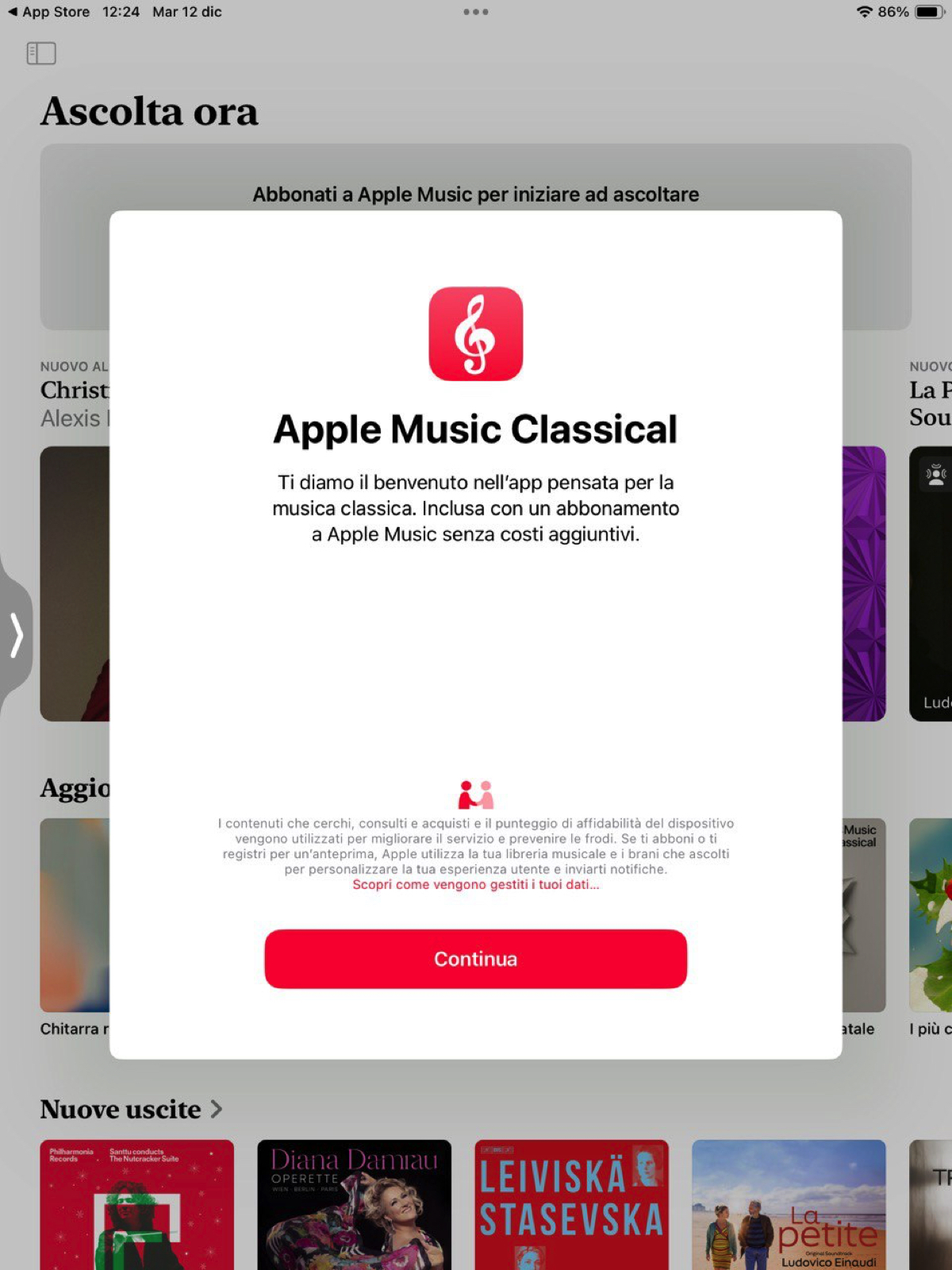 Classic però non “separa” la musica classica da quella tradizionalmente “leggera”. Anzi. Non solo compaiono su entrambe le app, ma quando si aggiorna il sistema operativo l’app di Classical rinvia a quella di Apple Music per gli aggiornamenti della privacy e altri tipi di informative di servizio. Si tratta quindi di uno strano tipo di app che “galleggia” sopra il servizio erogato da un’altra app.