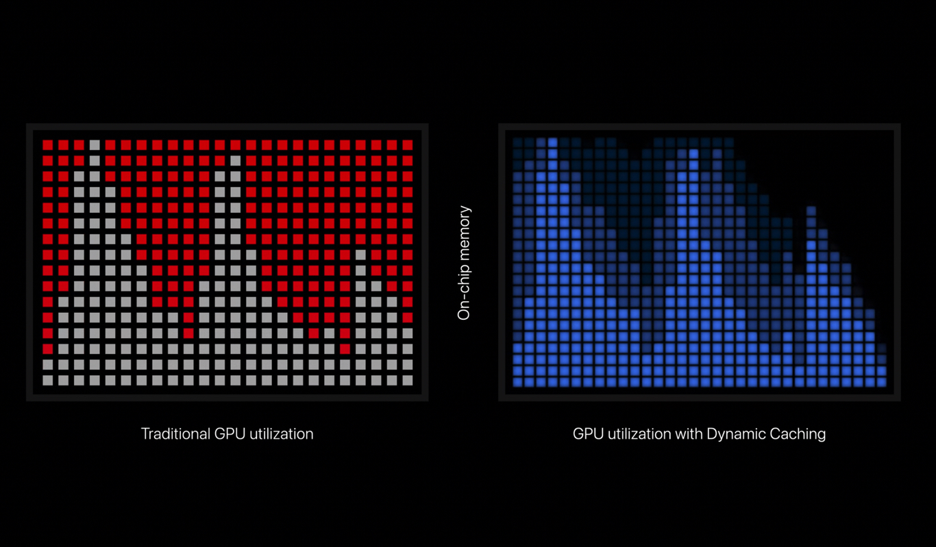 I chip Apple Silicon a partire da M3 vantano GPU con una tecnologia denominata Dynamic Caching, nuove funzioni di rendering come mesh shading e ray tracing con accelerazione hardware.