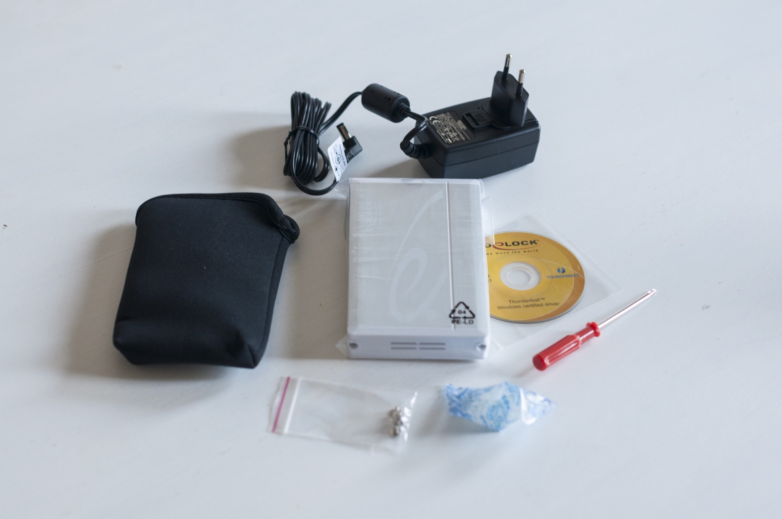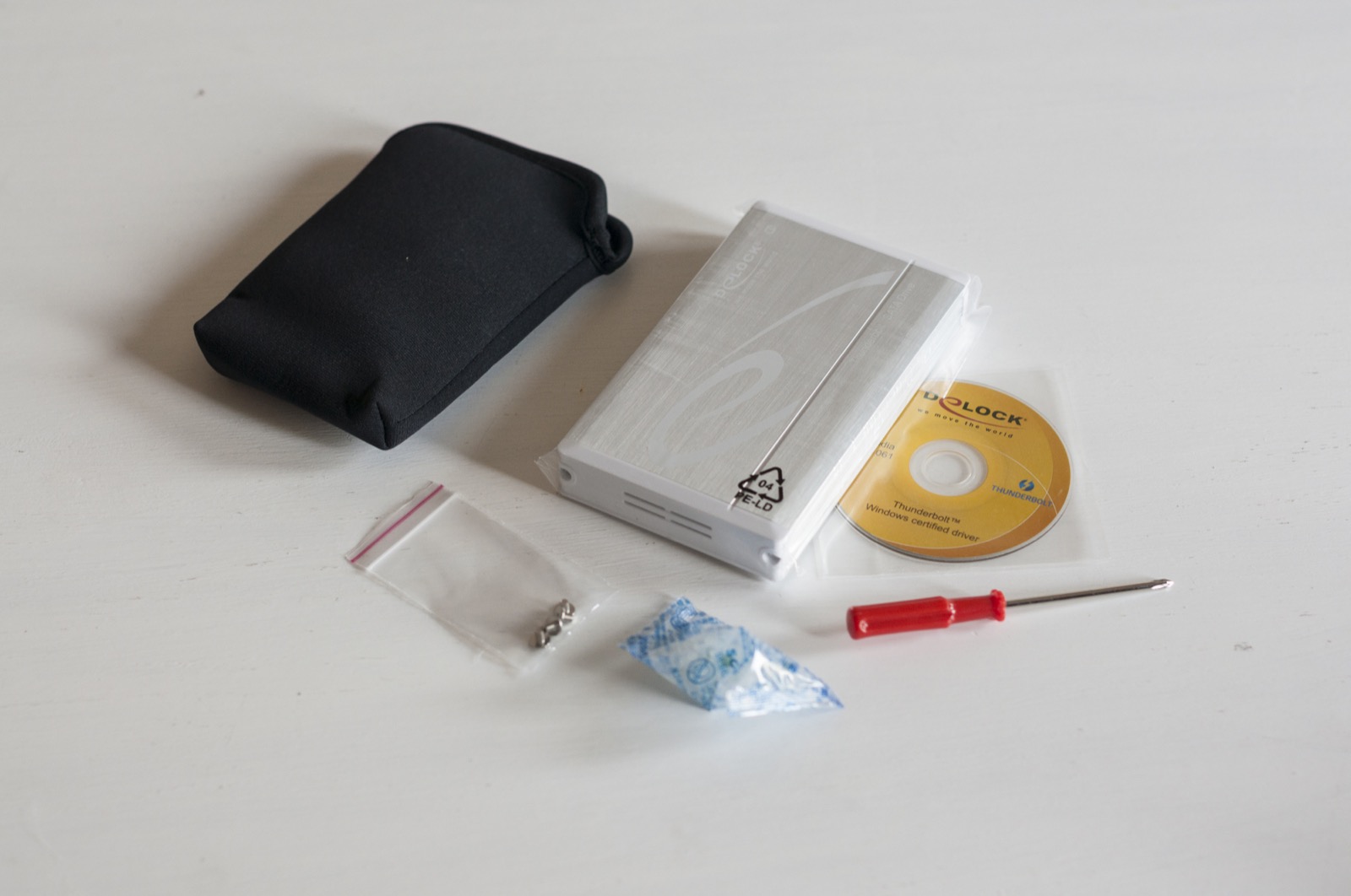 All’interno della confezione trovano posto il case vero e proprio, un disco con i driver (inutili su Mac), un cacciavite e le viti per gli agganci interni, una comoda custodia in materiale morbido e l’alimentatore.