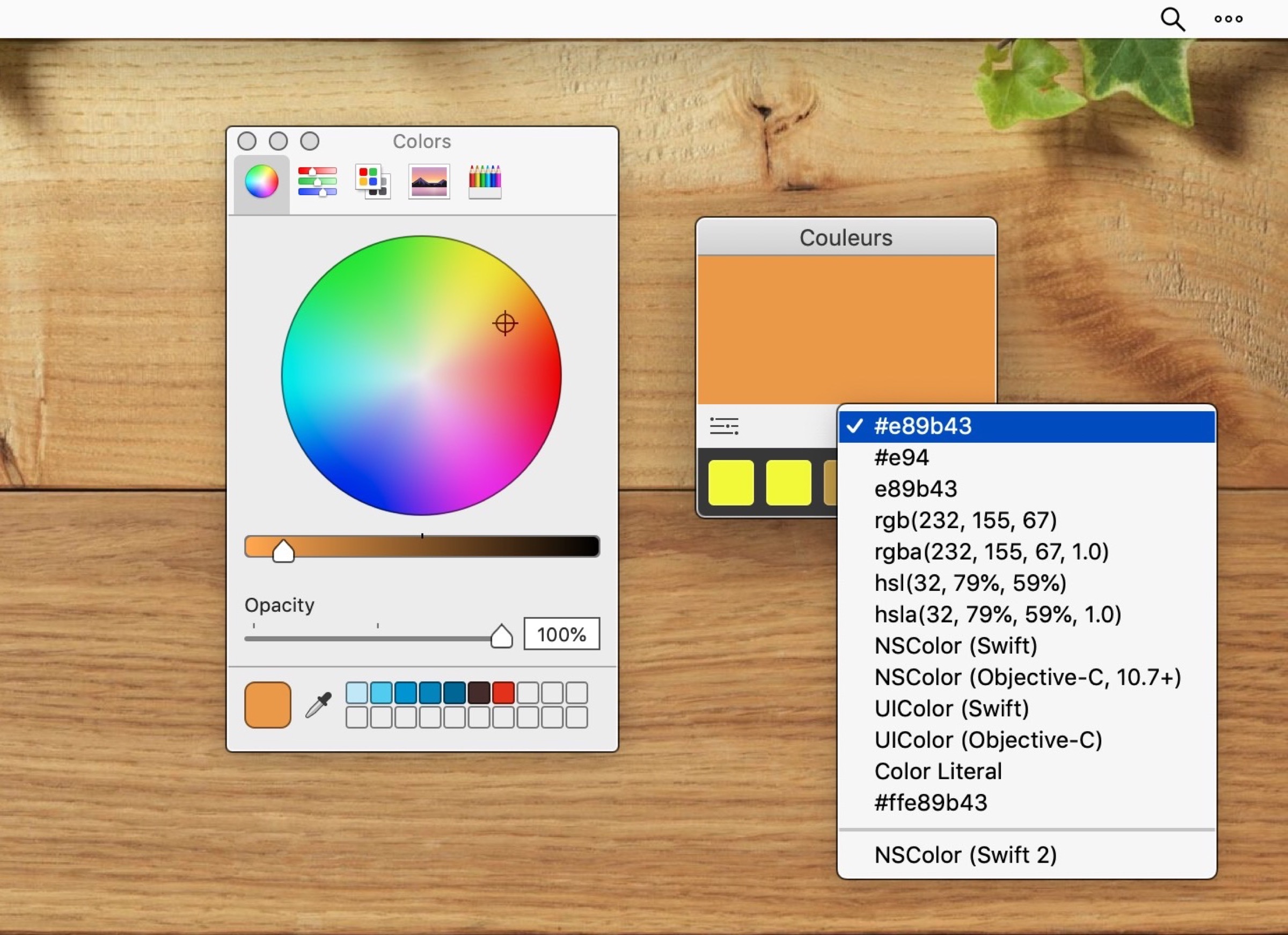 Ma allo stesso modo per gli sviluppatori di applicazioni che lavorano con il linguaggio Swift si rivelano utili i codici che, sempre nell’esempio dell’arancio-Macity, corrispondono alle indicazioni NSColor(srgbRed: 0.9117, green: 0.6065, blue: 0.2608, alpha: 1) oppure UIColor(red: 0.9117, green: 0.6065, blue: 0.2608, alpha: 1) che l’applicazione copia direttamente negli appunti nel momento in cui si seleziona uno di questi due formati.
