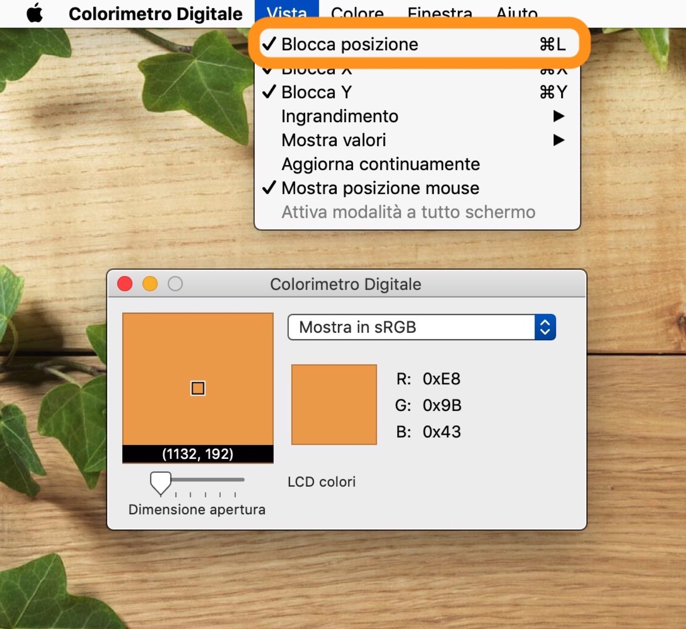 Ci viene in aiuto la barra dei menu, dove troviamo il comando Blocca posizione ⌘L che permette di fissare il colore scelto riprendendo così possesso del cursore del mouse. Poi con Copia colore come testo ⇧⌘C si va a copiare il codice negli appunti.