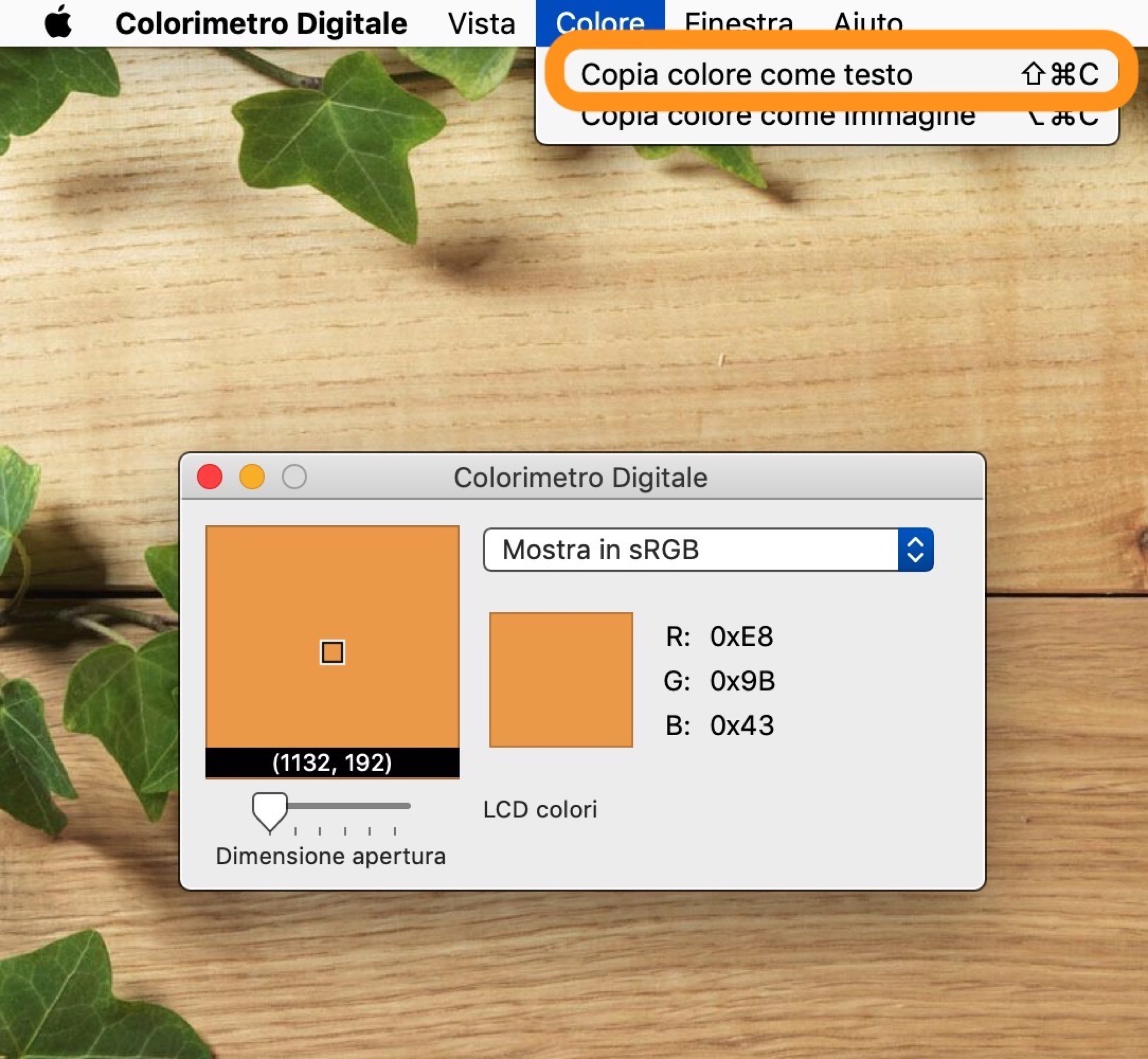 Nell’esempio in foto abbiamo prelevato il colore arancione usato da Macitynet che in HEX corrisponde al codice #e89b43. Con questo codice è ad esempio possibile replicarlo nelle applicazioni di fotoritocco come Photoshop oppure nello sviluppo delle pagine del sito web all’interno del codice HTML o CSS.