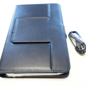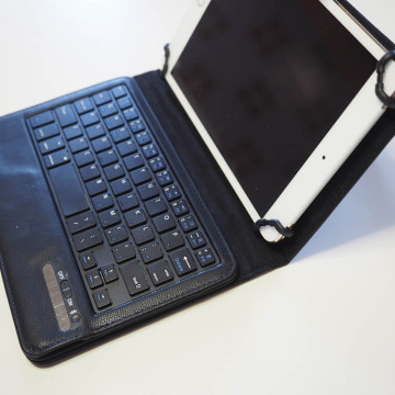 L’accessorio arriva a casa in una scatola abbastanza anonima all’interno della quale troviamo la custodia, la tastiera e un cavo Micro-USB. Parliamo di custodia e di tastiera perchè si tratta, anche fisicamente, di due oggetti separati anche se studiati per andare sempre insieme. La tastiera è una Bluetooth QWERTY (senza accenti ma la cosa costituisce un problema da poco, come diremo) che resta in posizione grazie a dei magneti. La custodia, abbastanza massiccia, non bellissima ma ben costruita e realizzata in piacevole pelle sintetica, è molto protettiva, è infatti realizzata con inserti rigidi che proteggono gli angoli e i bordi del tablet. Ha anche una linguetta di chiusura e una aletta sul retro che potremo aprire per usarla come supporto per scrittura.