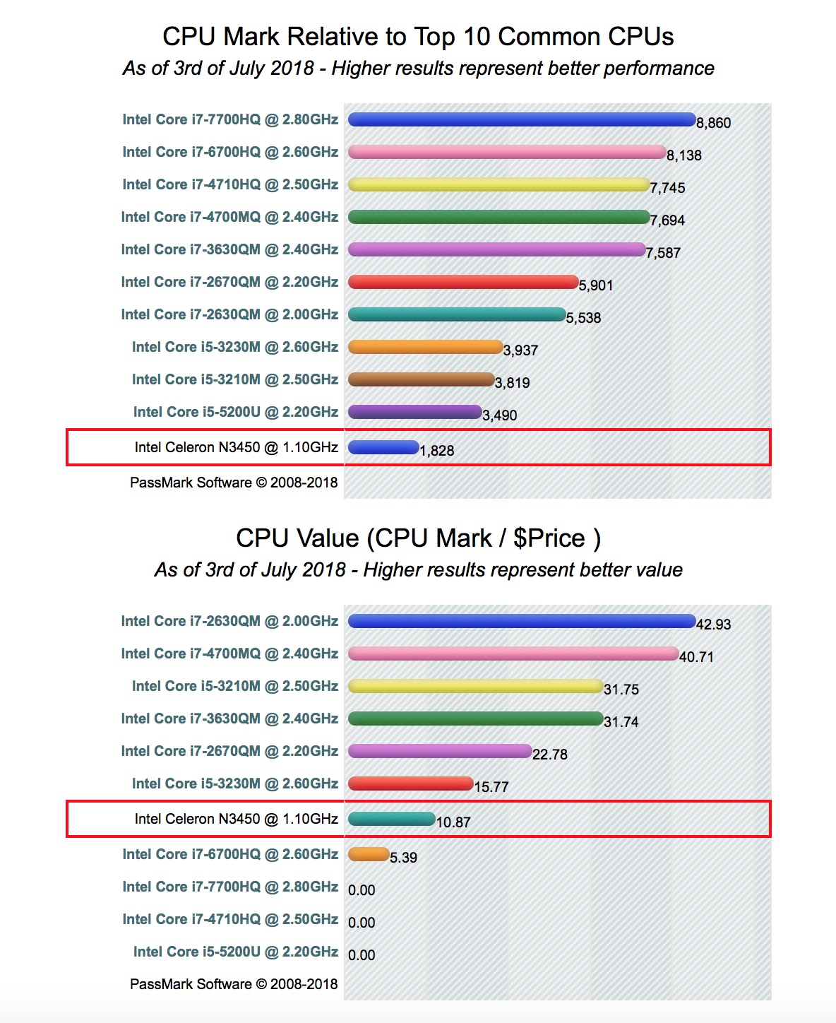 Qui sotto abbia un confronto con altri chipset più noti che equipaggiano i modelli più performanti ed un rapporto prezzo/prestazioni che indica come per alcuni task può essere conveniente puntare sul prezzo ridotto e sulle prestazioni di Apollo Lake.