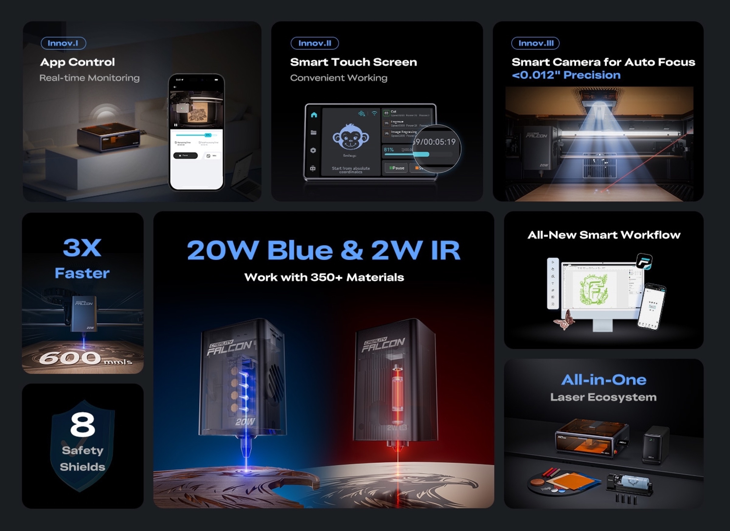 Si tratta dell’evoluzione del Falcon A1 e si rivolge a un pubblico che va dagli hobbisti ai professionisti in quanto è capace di lavorare su oltre 350 materiali diversi inclusi metalli verniciati e ceramiche.