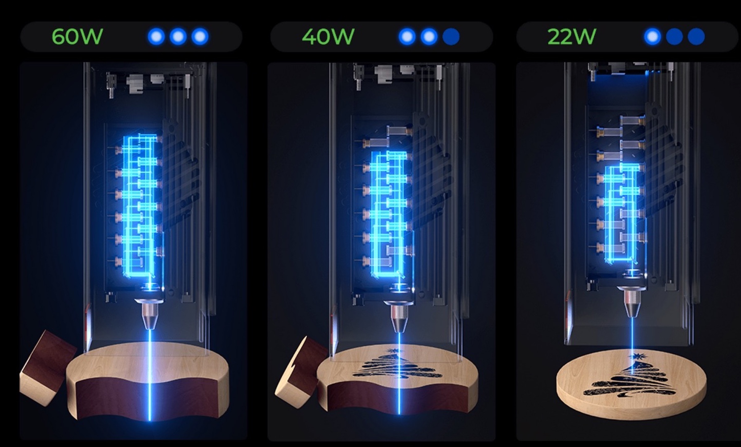 - Con il massimo di 60 Watt si lavorano invece materiali duri e densi come metalli, assi di legno spesse e gomma.