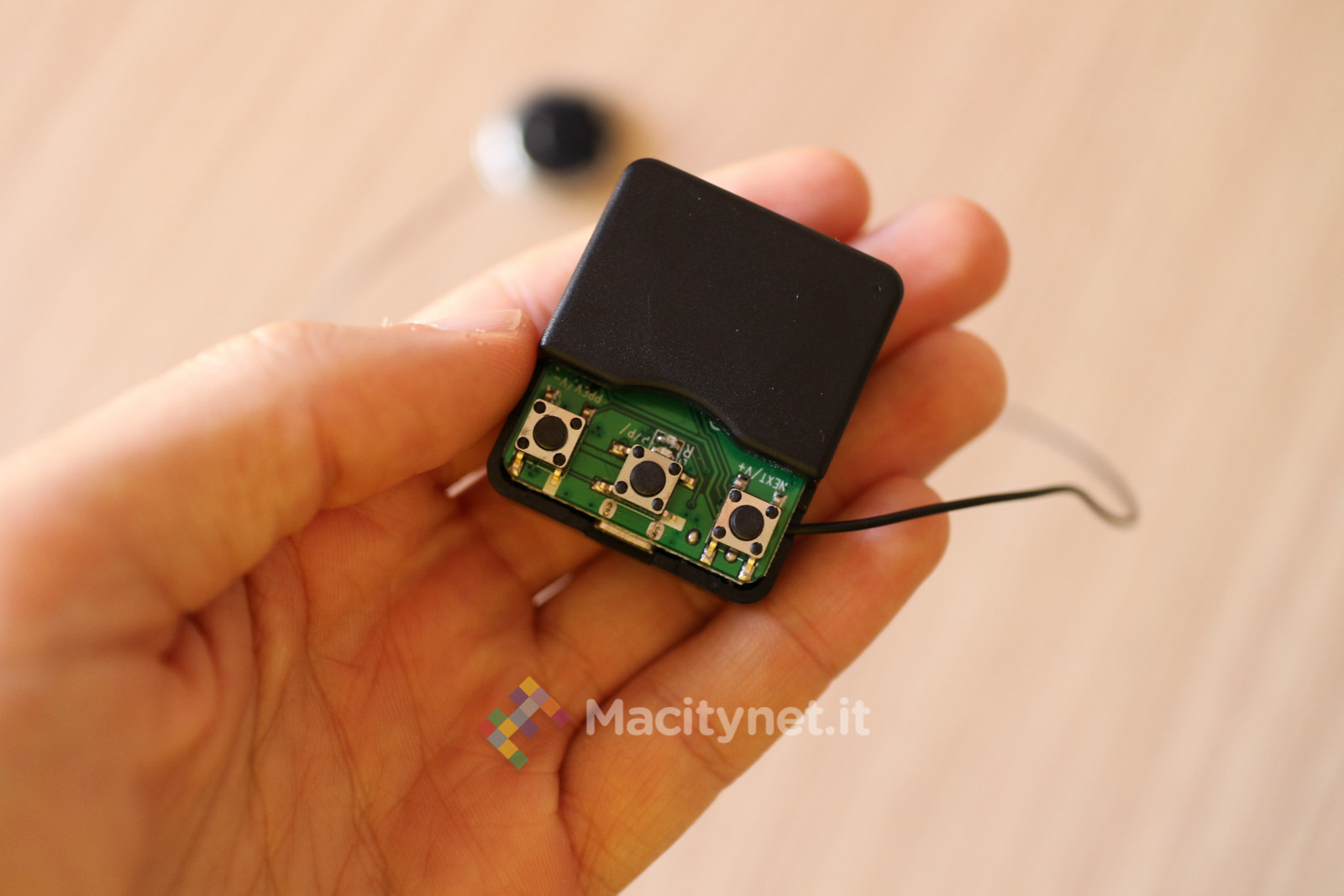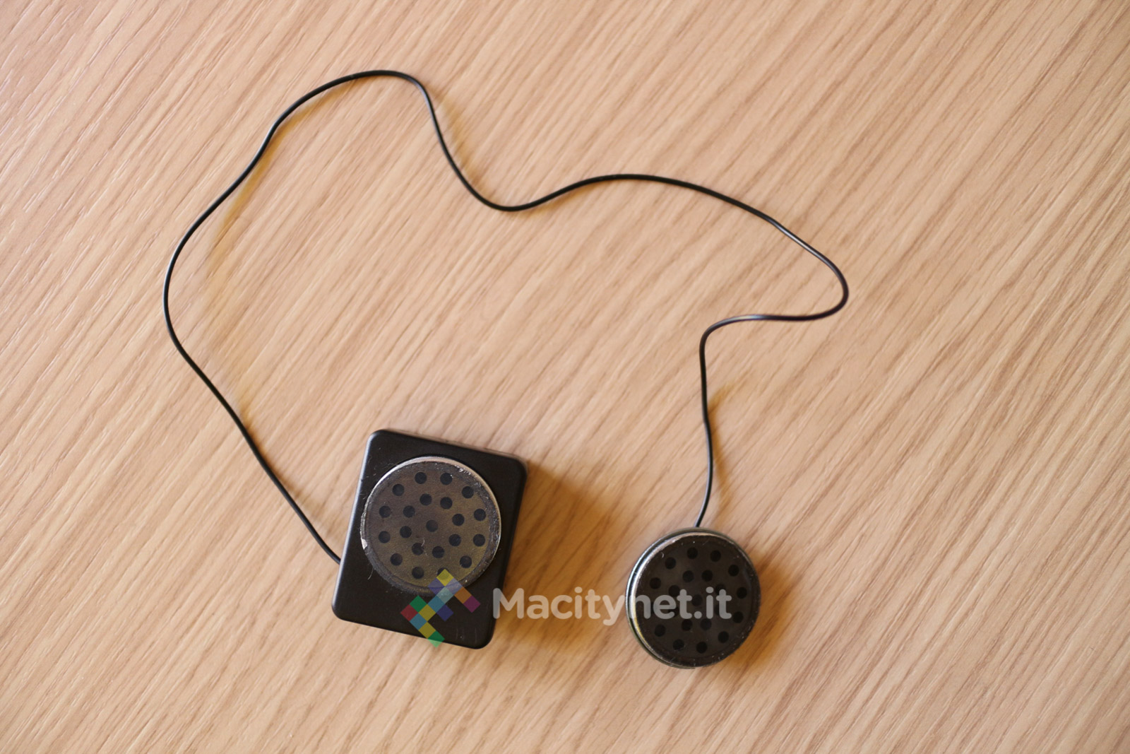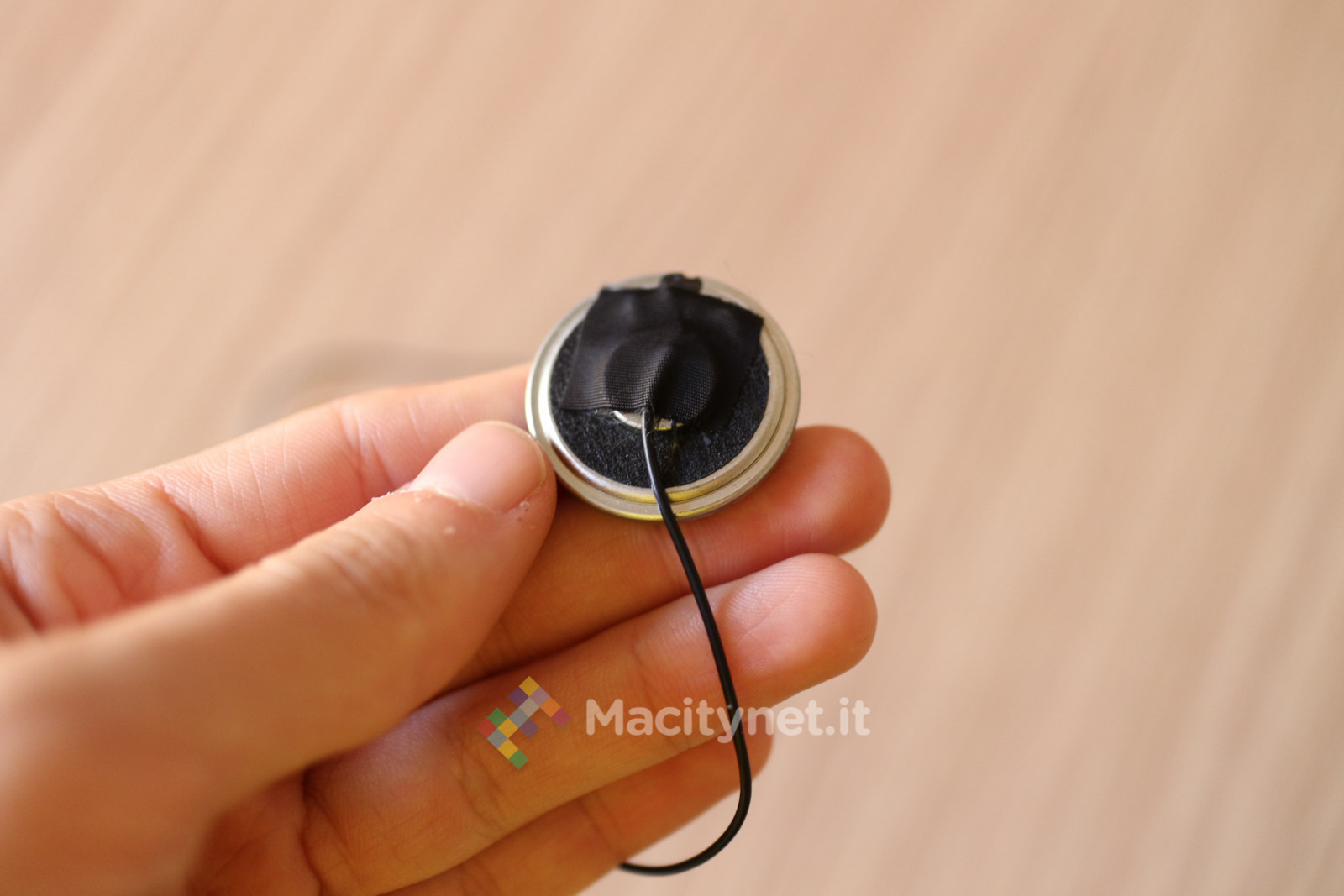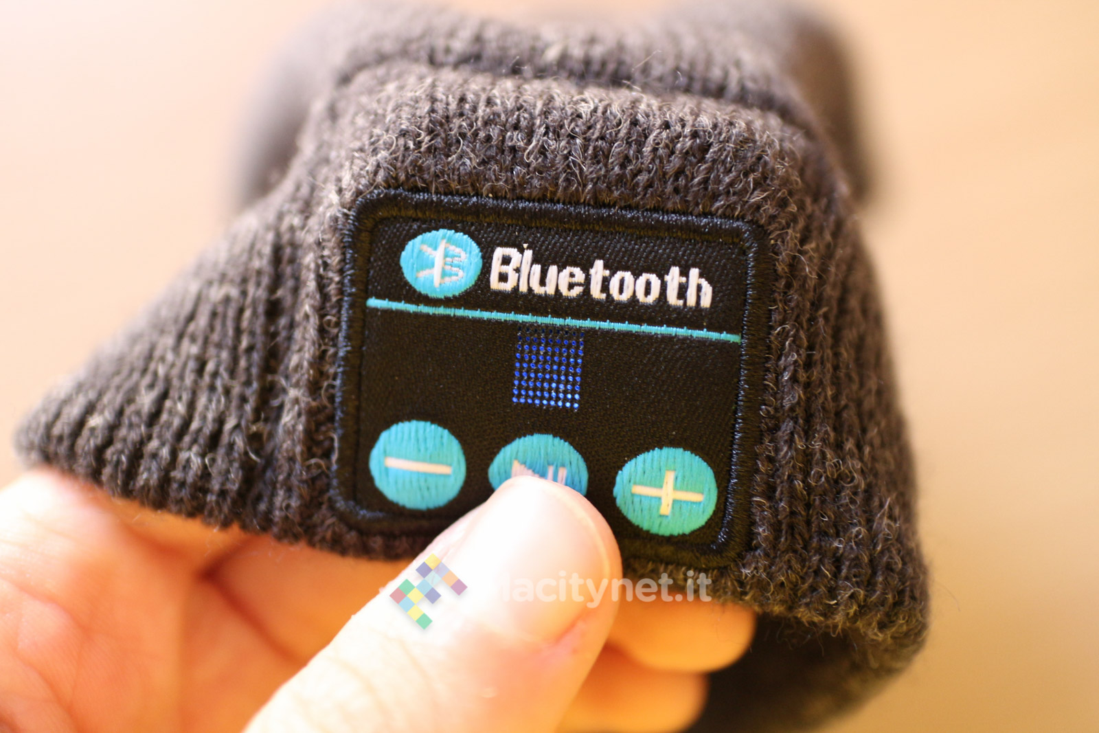 La cuffietta più grande è accompagnata da una etichetta che mostra la dicitura Bluetooth e la funzione dei tre pulsanti incorporati: è infatti possibile avviare o mettere in pausa un brano, saltare le tracce avanti e indietro o regolare il volume con la semplice pressione dei tre tasti. Anche qui, quando si re-inseriscono le cuffie, va prestata particolare attenzione a far combaciare quanto più possibile i pulsanti al loro rispettivo indicatore. Sul bordino inferiore c’è poi una apertura per l’ingresso microUSB, utile per ricaricare le cuffie senza doverle rimuovere dal cappello.