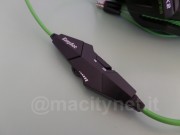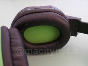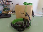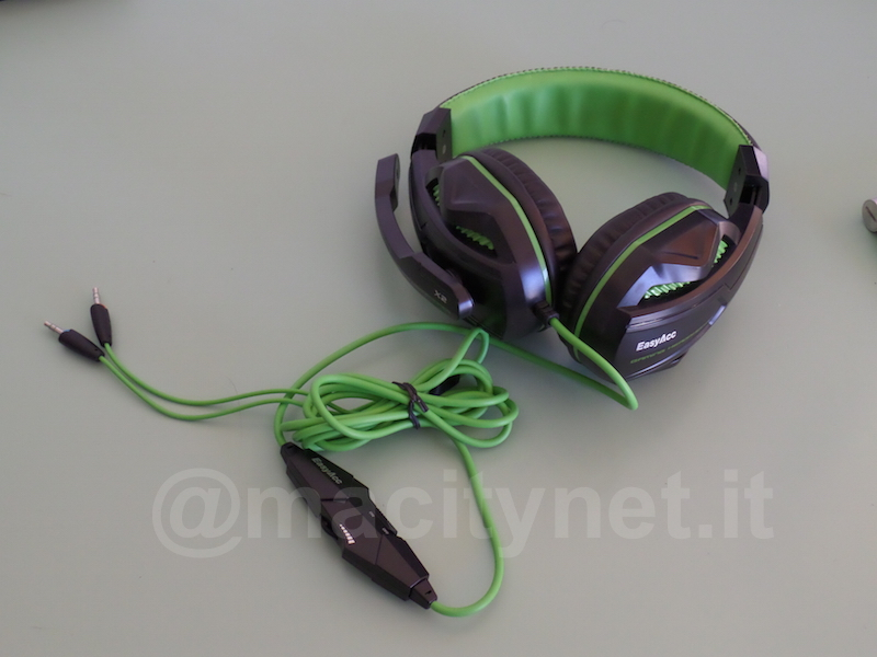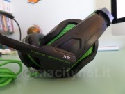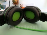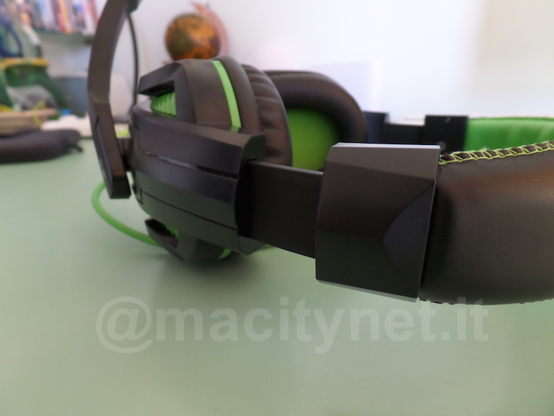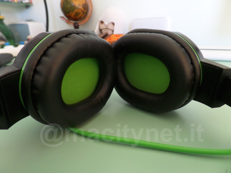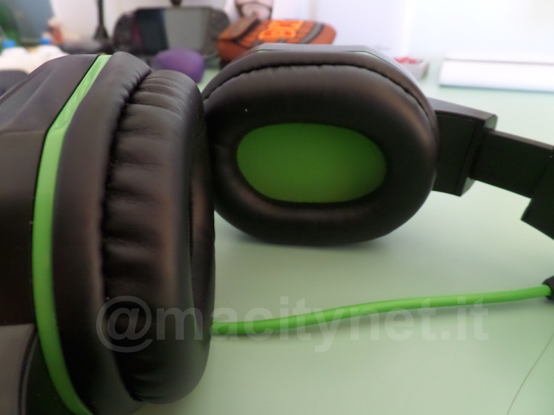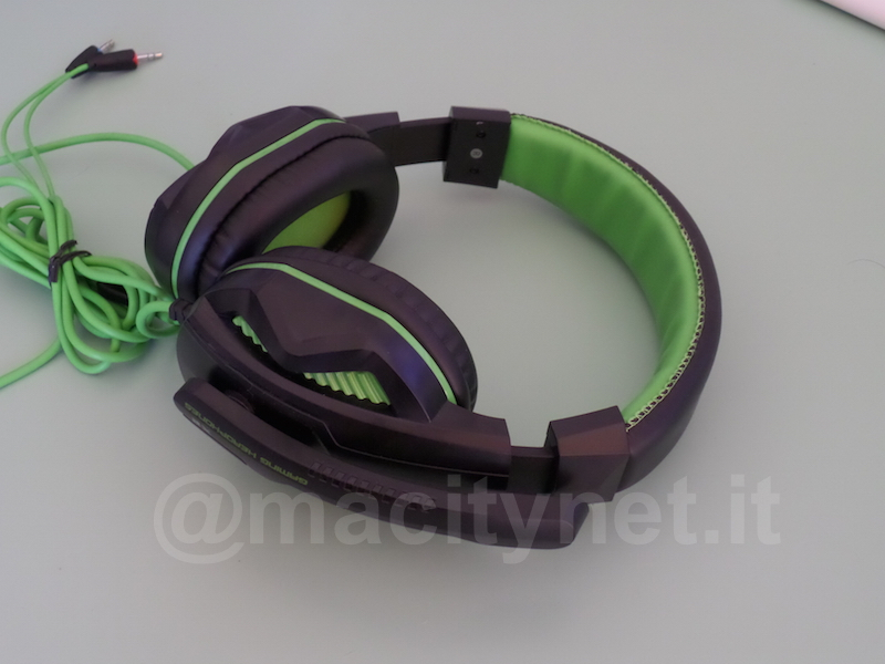 Spedite all’interno di un voluminoso pacco in cartone, le cuffie si presentano stilisticamente come aggressive: imponenti e dalle tonalità accese, verde e rosso. Quella testata da Macitynet presenta accenti verdi, alternate al classico nero. Il filo è completamente in verde, particolarmente lungo, alle cui estremità sono disponibili i due jack per cuffie e microfono. La presenza dei due jack separati, fa sì che le cuffie risultino compatibili soltanto con i PC che dispongono di tali ingressi, mentre su altre macchine dove è presente il solo ingresso cuffia, sarà impossibile utilizzare il microfono. Su iMac, ad esempio, è possibile ascoltate solo il suono, visto che è assente l’ingresso microfono. Il look aggressivo di queste cuffie si sposa perfettamente con la filosofia per le quali sono state progettate, ossia soddisfare le esigenze dei gamer che giocano online, in sessioni accompagnate anche da chat audio video. Insomma, una cuffia che vuole dare l’idea di qualcuno “duro a morire”. I padiglioni auricolari sono molto ampi, anche se non offrono, a cuffie spente, alcun senso di isolamento. L’escursione dell’archetto non è molto ampia, ma nel complesso data la stazza delle cuffie, ben si adattano a qualsiasi misura.