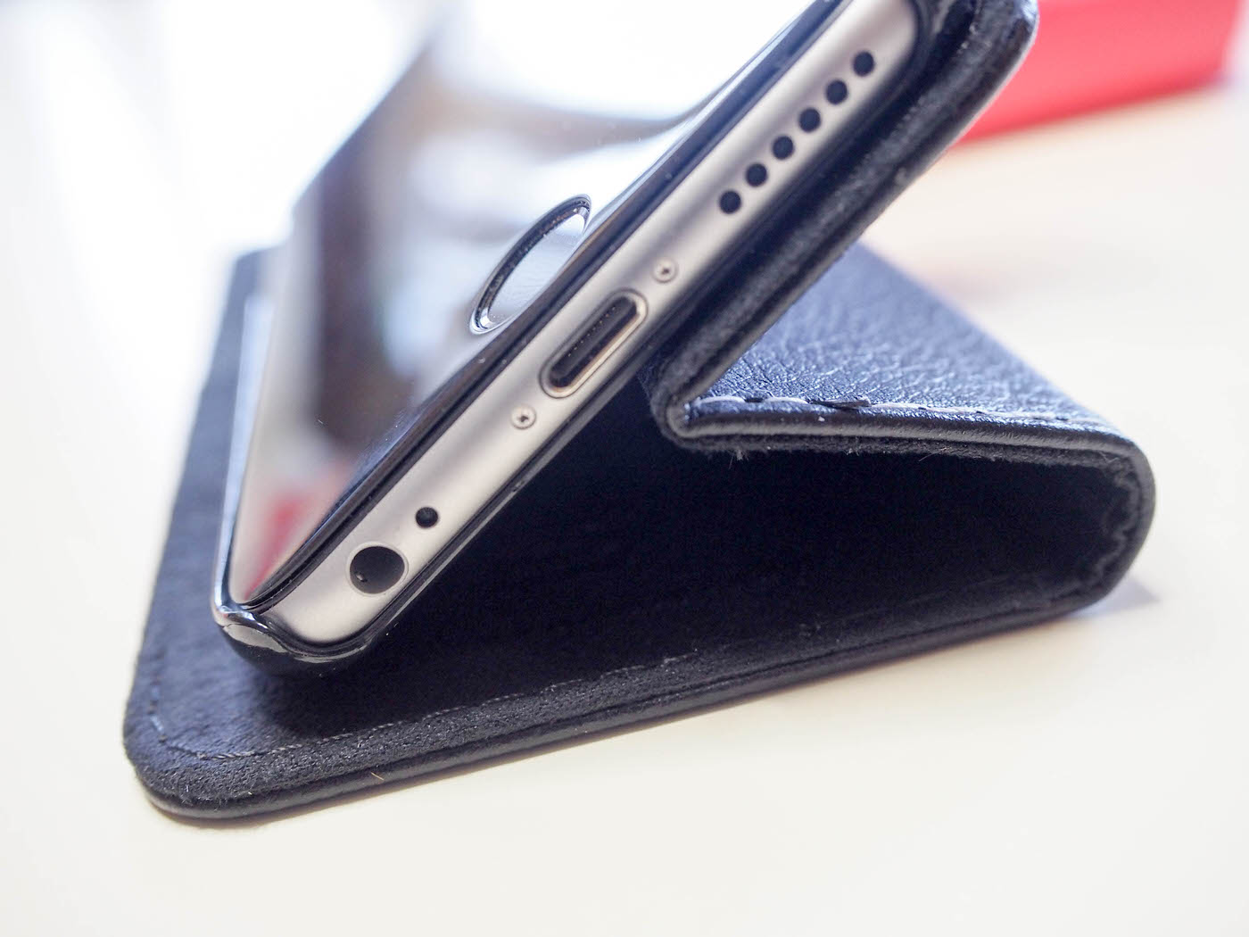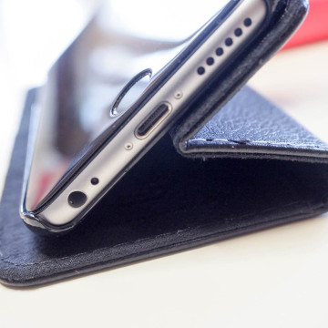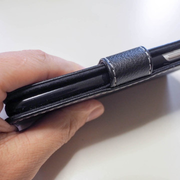 La custodia è conformata anche per tenere l’iPhone in orizzontale, come se fosse un supporto da tavolo. Non ci sono particolari fermi o agganci a questo scopo. Basta piegare la parte dove avremo incastrato l’iPhone e il gioco è fatto. In questo modo avremo la possibilità di vedere un film o di navigare senza avere la necessità di tenere in mano il telefono.
