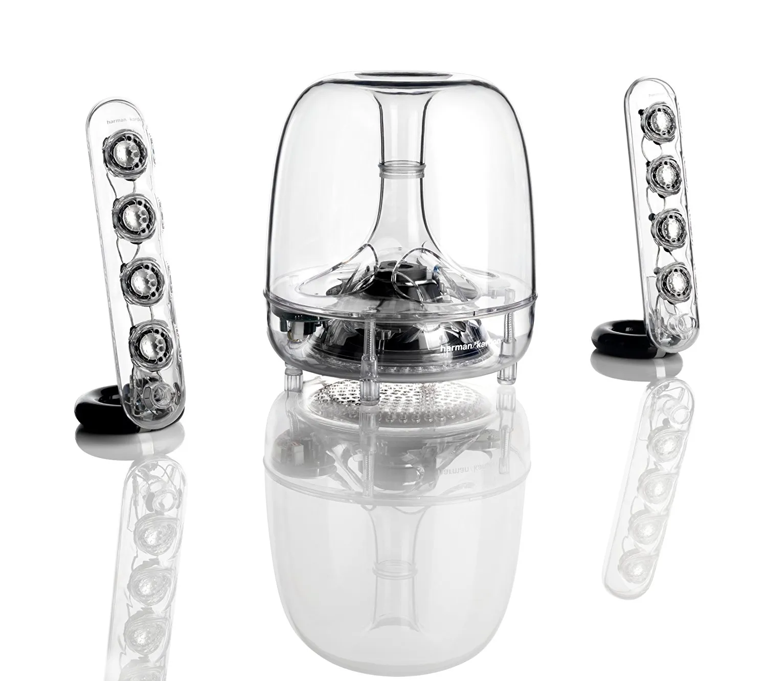 Il prodotto è ben consciuto. Si tratta di un accessorio storico del grande produttore americano del settore Hi-Fi e che da anni accompagna, benchè non sia esclusivo per essa, la piattaforma Apple. Erano stati presentati nella loro prima versione qualche tempo fa, nel contesto di un Macworld, e si cartatterizzano per un look trasparente e sono realizzati in tre elementi, una unità bassi e due satelliti per il suono dei canali desto e sinistro. La loro evoluzione li ha portati alle specifiche tecniche attuali: quattro trasduttori Odyssey di Harman Kardon con equalizzazione ottimizzata tramite computer per satellite, un subwoofer potente da 6 pollici e 20 watt orientato verso il basso, controlli a sfioramento facili da usare, controllo del volume Subwoofer, satelliti con angolazione regolabile, compatibili con tutti i dispositivi con uscita mini-jack stereo, iPhone, iPad e iPod inclusi, oltre che il Mac.